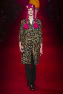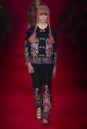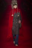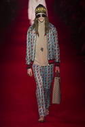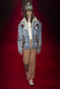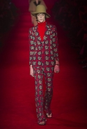 Итак, что мы имеем? Половина героев по-прежнему в очках, в программе те же бабушкины кофты, собранные из рюш платья, найденные в бабушкином же сундуке, узорчатые брючные костюмы, на этот раз с оптическими принтами, цветочные детали и мотивы и новое поколение героев для аппликаций и вышивок. Например, пара китайских драконов или другие птицы, вьющие гнездо в кроне дерева. Но кое-какие перемены все-таки, конечно, произошли. Вместе беретов на этот раз, например, вязаные шапочки с маленькими помпонами на макушках и с «ушами». Некоторые костюмы выглядят в точности как сценические наряды какой-то звезды 70-х (кстати, о звездах: нельзя упустить из виду трибьют Боуи, который легко мог бы пройти незамеченным, потому что обнаружился на спине одной из курток). А к ретровещам, которые вы могли бы найти, покопавшись в гардеробе у старших родственников, добавились другие, уже откровенно чудаковатые — вроде «коровьего» кейпа или велюрового спортивного костюма впечатляющих размеров. Но ковбои эти тоже, конечно, игрушечные и увиты цветами.