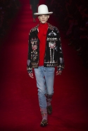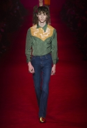 И что важно, если раньше Микеле в основном брал какие-то детали девичьего стиля, добавляя их в мужские образы, теперь он берется и за вещи, ассоциирующиеся со стереотипными образами традиционной мужественности. Рядом с кардиганом в мишках или разрисованным цветами воротничком обнаруживается ковбойская рубашка. Где-то неподалеку всплывает огромная джинсовка, репутация у которой примерно такая же, как у куртки-косухи. И наконец, рядом с пестрыми клешами или брюками «немужского» канареечного цвета вышагивает пара простых джинсов.
