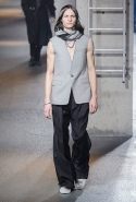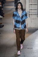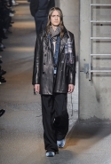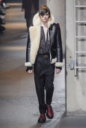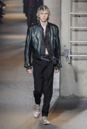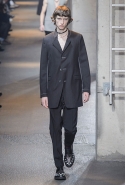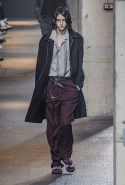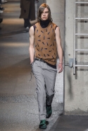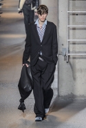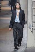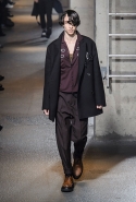 Главными, как всегда, стали очень свободные и плавные силуэты: костюмы, похожие на пижамы, плащи-халаты, просторные брюки, становящиеся только шире книзу, куртки и пальто, с нарочно закругленной линией плеч, которую в мужской одежде обычно выделяют. Довольно «свободное» настроение на этот раз подчеркивается еще и принтами, прикидывающимися tie day, — «вареные» рубашки с цветными разводами хмурые юноши надевают поверх водолазок. И хотя мрачные взгляды из-под темных челок все эти попытки сыграть удобство автоматически сводят на нет, сколько бы ни старались силуэты, вокруг запястий у моделей повязаны для убедительности еще и пестрые платки. Такое же DIY-ощущение оставляют куртка, сшитая из кусочков разноцветной (разных оттенках серого и коричневого) замши, такой же меховой бомбер или «змеиный» пиджак, вдруг оказывающийся частью черного пальто.