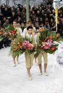 Карл Лагерфельд, бессменный и неутомимый директор французского дома, всегда подходит к каждому из своих показов, будь это сезонное шоу, круизное, предосеннее или кутюрное, с выдающимся размахом. Но все же неделя высокой моды — особый случай. На этот раз в просторных залах Grand Palais дизайнер на один день взрастил настоящий тропический сад. И в обновленных интерьерах, среди дремучих и колючих белых трав, похожих на декорации для грандиозного детского спектакля, разыграл свою цветочную сказку. Сначала на подиум вышел садовник (и его, и всех последующих санитаров леса Карл Лагерфельд отбирал лично — случайному человеку такой интимный процесс не доверить) с лейкой, и только потом тропики по-настоящему ожили: вдобавок к огромным бутонам, и так покрывающим стены помещения, по подиуму потянулась целая вереница жительниц французского Цветочного города.