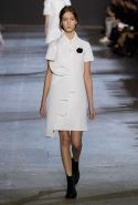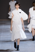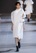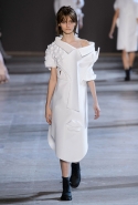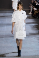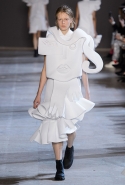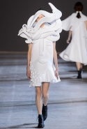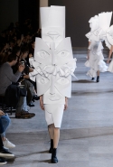 Получились у голландцев не полотна, а прекрасные ожившие скульптуры, похожие то на языческих идолов, то на удивительных существ из сновидений, то на кубических дев-Франкенштейнов. Простые белые поло, словно из бумаги, обрастают глазами, губами, завитками волос, руками — и всем в количествах, не ограниченных обычной человеческой анатомией. На боку, например, может вырасти грудь, а лицо может уплыть куда-то вверх и сиять на полметра выше, чем находится настоящая голова модели, утопающая в слоях этого белого полотна. Выглядит все совершенно невероятно и, конечно, не имеет ничего общего ни с каким realistic couture, ставшим особенно актуальным.