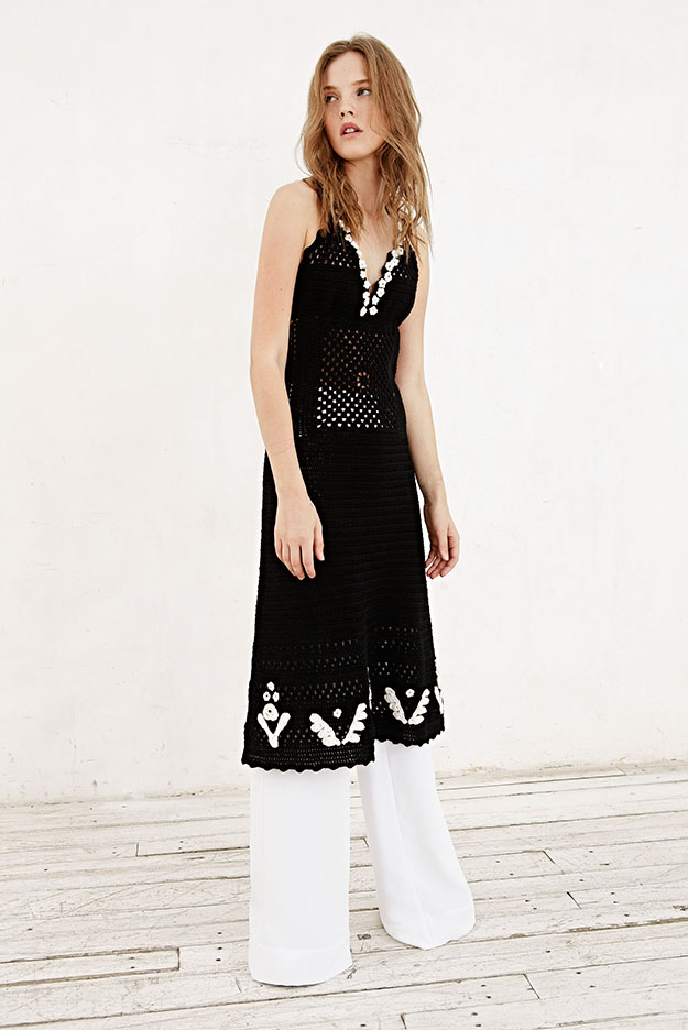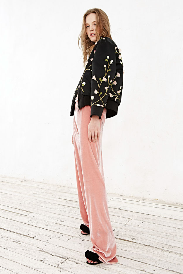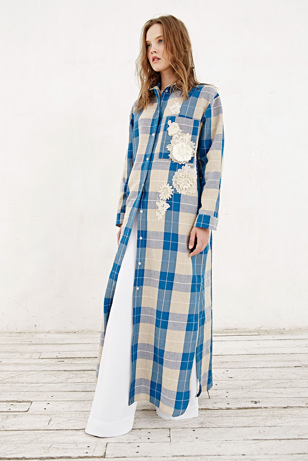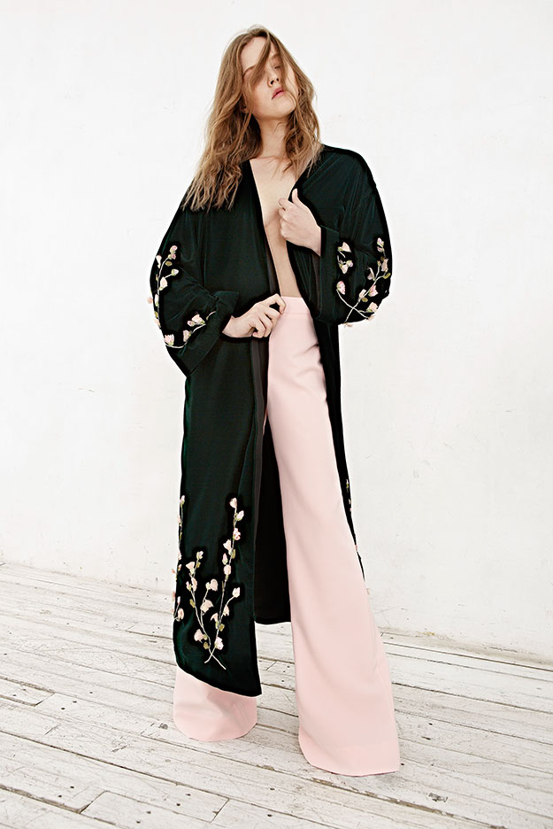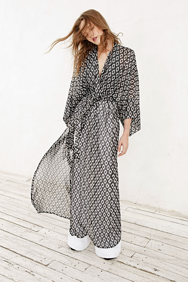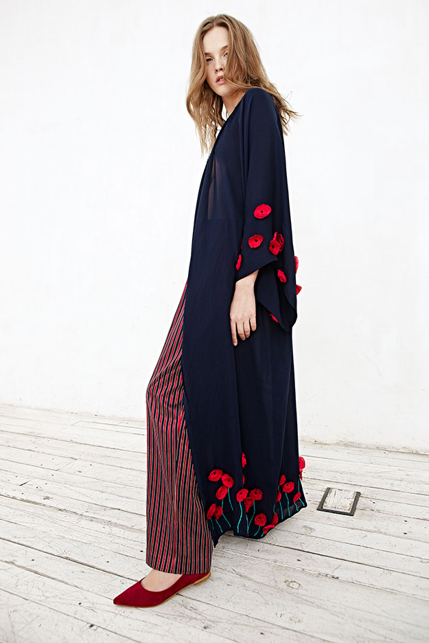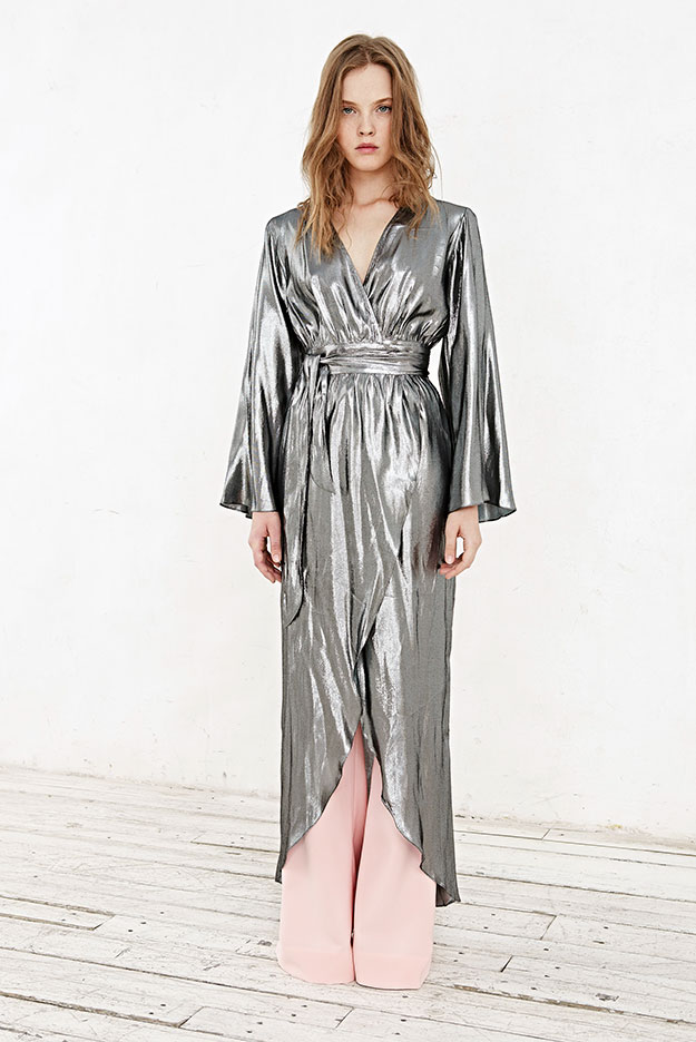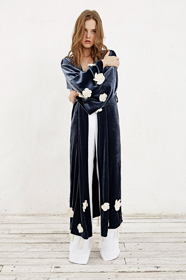 Коллекция делится на две части: Night и Hippie. В Night используются золотые и серебряные ткани, благодаря которым даже самые заурядные пижамы, халаты и туники превращаются в вечернюю одежду. В части Hippie также представлены туники и легкие халаты, но совсем в другом прочтении: одежда декорирована яркой ручной вышивкой и аппликациями с отсылками к 70-м и 80-м годам.