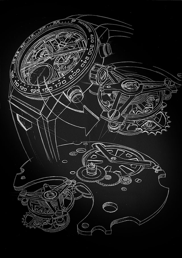 Корпус нового хронографа выполнен из титана и крепится на руку ремешком из черной матовой кожи аллигатора на черной каучуковой подкладке. Модель водонепроницаема и имеет запас хода более 65 часов. В хронографе реализован парящий турбийон. Устройство изготавливается вручную 4 часовыми мастерами. Особенность этого механизма в том, что каретка турбийона закреплена с одной стороны, без фронтального моста, благодаря чему можно любоваться этим великолепным устройством без каких-либо затруднений.