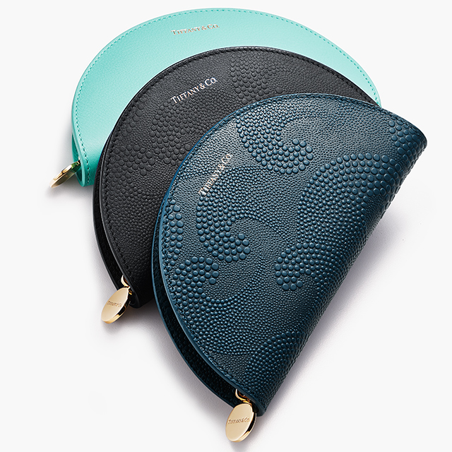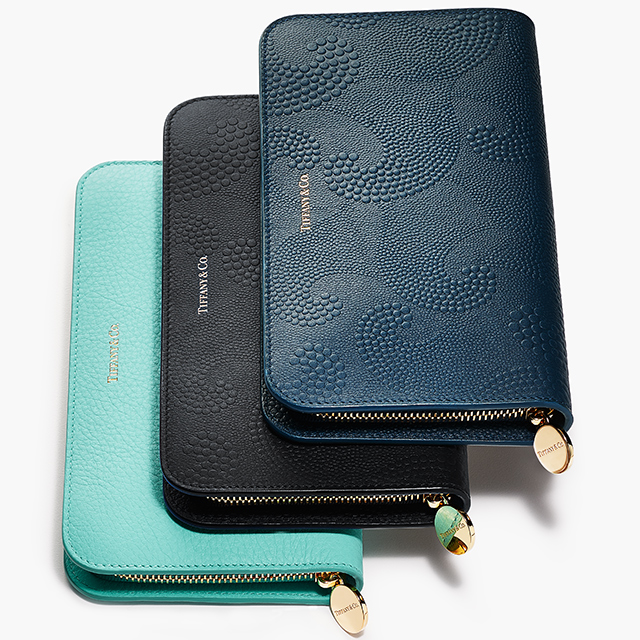 Новые аксессуары выполнены в пяти цветах: черном, коричневом, синем, зеленом и фирменном бирюзовом. Некоторые кошельки и визитницы украшены волнообразным мотивом в японском стиле, напоминающим о знаменитой картине Кацусики Хокусая. Впервые этот мотив был использован дизайнером бренда Эдвардом Муром в 1871 году и с тех пор считается историками и музейными кураторами классическим узором Tiffany.