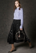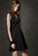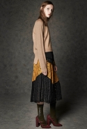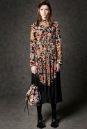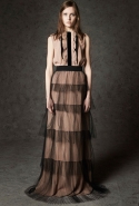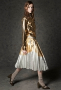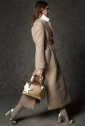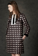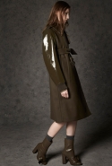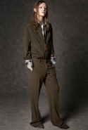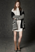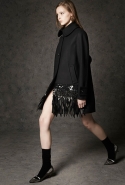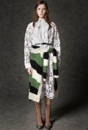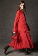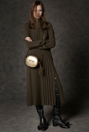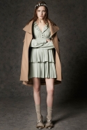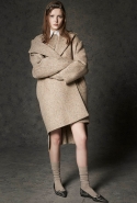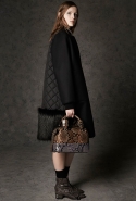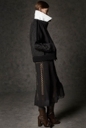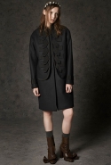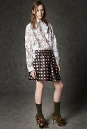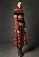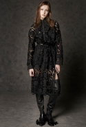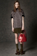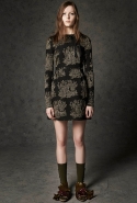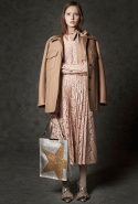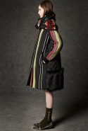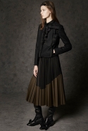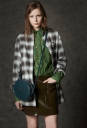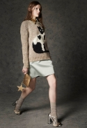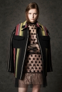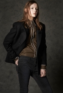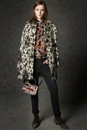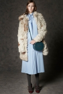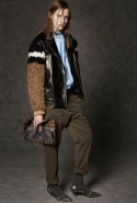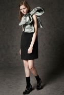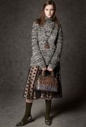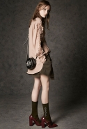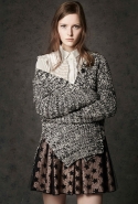 Где-то посередине, между этими двумя полюсами прячутся и другие грани, но именно так обозначенный контраст, конечно, выглядит наиболее показательным. Девушка в вязаном свитере с кошкой против девушки в костюме цвета хаки. Мини с пайетками и перьями, длинные платья с оборками, а рядом кожаные вещи и платья, перешитые из огромных клетчатых рубах. Кружевные блузы и платья против грубых свитеров и шерстяных пальто, их окружающих (тот же ход недавно использовал Кристофер Бейли для Burberry, но в его версии почти все кружева достались мужчинам). Это столкновение двух полюсов можно обнаружить даже в одной вещи — особенно показательной выходит верхняя одежда, суровые по силуэту пальто с массивными плечами, выполненные к тому же в темных тонах, но с отделкой из лент в тон. Они могут лежать на груди, напоминая золотые канты на гусарском мундире, могут висеть ровной бахромой, а могут становиться бантами.