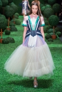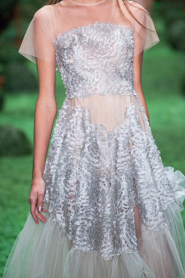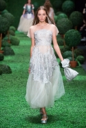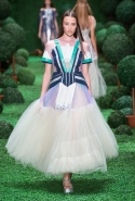 Третья глава посвящена ар-деко. Но мозаичные узоры в духе 20-х уравновешиваются воздушными, пышными вставками из тюля: трапециевидное платье, например, вдруг обрывается, неожиданно переходя в воздушную пачку и разрушая привычные пропорции. В руках моделей к этому моменту уже не клатчи с бахромой, а хрустящие блестящие пакеты, похожие на подарочную упаковку. И музыка с чего-то бодрого и электронного меняется на песню на русском, поющуюся пронзительным девичьим голосом. Пачки и настоящие облака тюля, на которые больше всего похожи некоторые из выводимых на подиум платьев, саундтреку удивительно соответствуют. А после них начинается уже последняя, завершающая часть шоу — платья из органзы и шелка расписаны огромными, в десятки раз увеличенными в размерах цветами.
