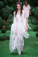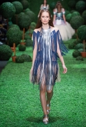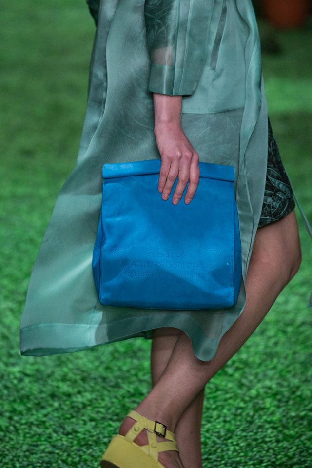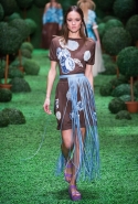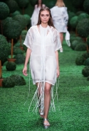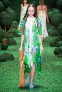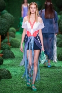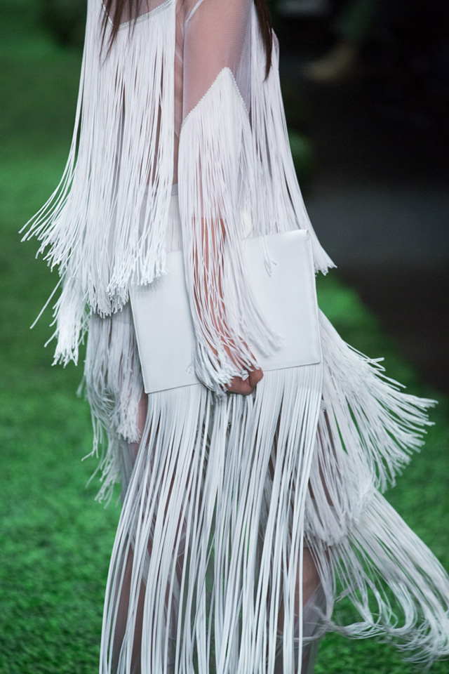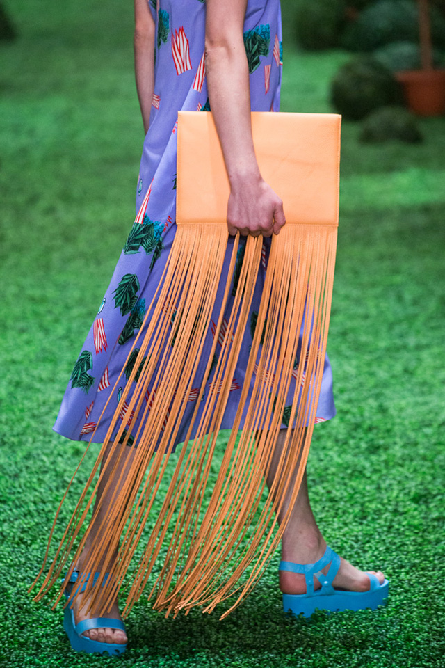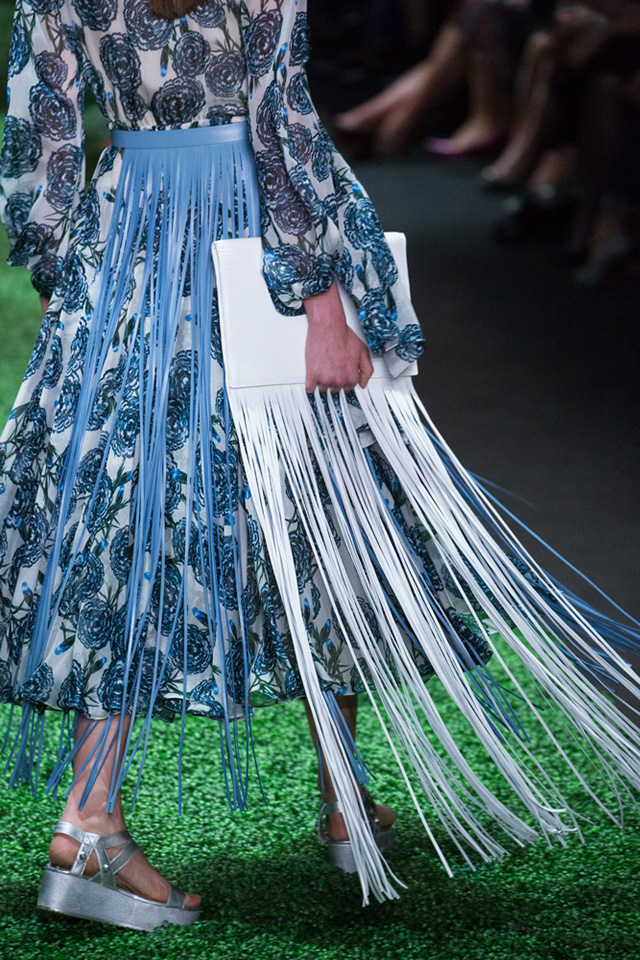Особенную роль в коллекции играет бахрома. Она стелется по полу вслед за обшитыми ей клатчами, которые определенно станут одним из главных хитов сезона среди клиенток дизайнера. Прикрепляется к тонким ярким ремешкам, перетягивающим воздушные цветочные платья. А иногда и вовсе покрывает костюмы почти целиком — и смотрится это удивительно эффектно.