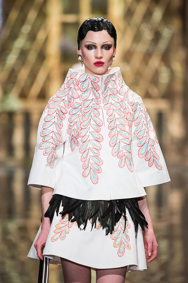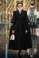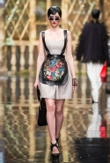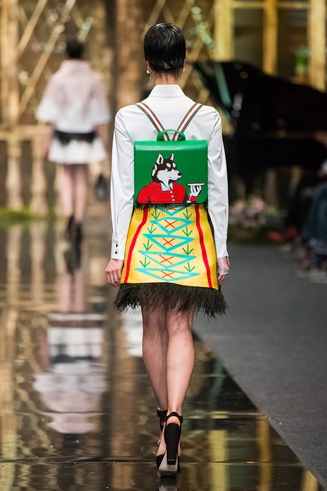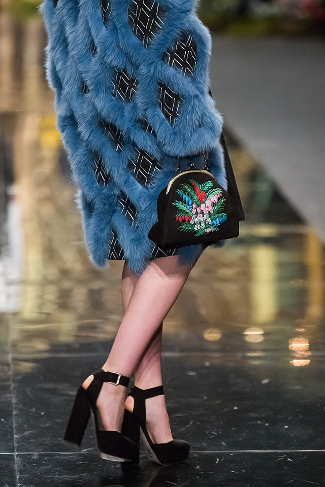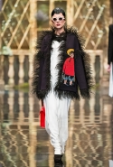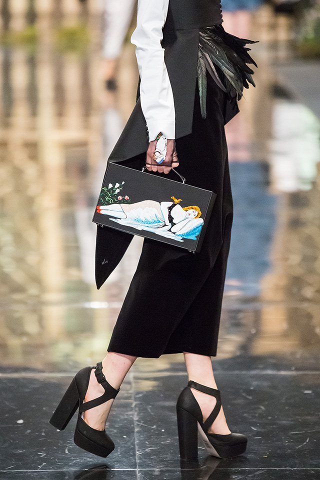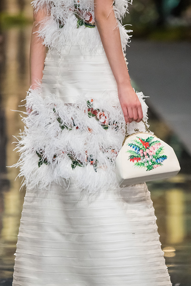 До того как представить свою коллекцию на подиуме в Гостином дворе, Александр Арутюнов уже дал поклонницам марки подсказку о том, чего ждать в осенне-зимнем сезоне. Первыми «ласточками» оказались, как всегда, аксессуары. Еще в начале марта команда модного дома представила капсульную коллекцию сумок с аппликациями и вышивками, сделанными по мотивам полотен грузинских художников Нико Пиросмани и Ладо Гудиашвили. Вместо знакомой каждому девочки с шариками на портфелях, рюкзаках и сумках появились, например, навьюченные ослики, мудрые старцы и усатые мужчины в национальных ярких костюмах. Те же персонажи пробрались и на подиум: кто-то по-прежнему смотрел на зрителей только с аксессуаров, а кому-то нашлось место и на свитерах, и на нарядных легких пальто с перьевой оторочкой. Нашлось место и для вышитых цветов, которые до этого украшали только забавные и немного старомодные ридикюли, — в Гостином дворе они расцвели и на басках-фартуках из черной кожи.