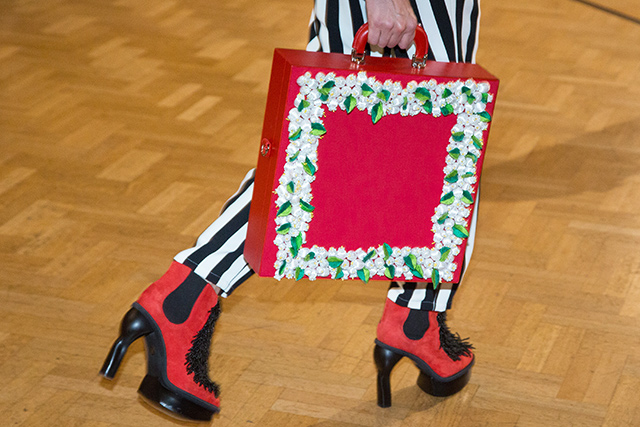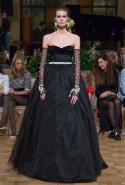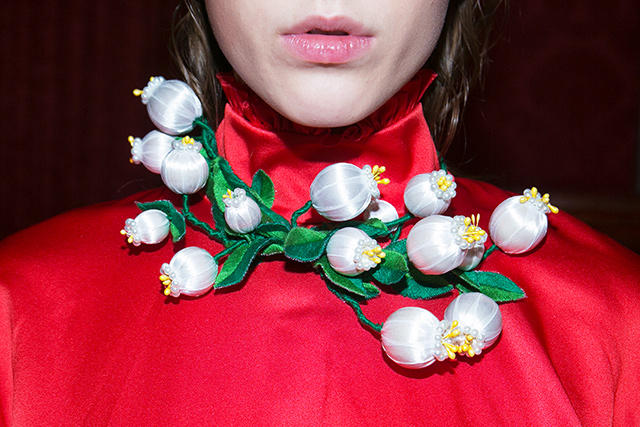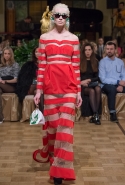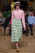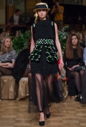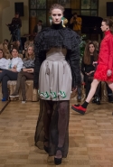 Поэтому за джинсой и гусями здесь идут бархат и шелк, а роскошных платьев почти кутюрного вида и костюмов, покрытых вышивками и аппликациями, намного больше, чем более минималистичных вещей. Юбки многослойны и держат форму, обнаруживая в себе очевидных потомков объемных кринолинов, собранные из крупных и мелких оборок жабо, рукава и целые платья смотрятся уже почти театрально, но, признаем, эффектно. И даже из ворота бомбера выглядывает еще один воротник, высокий и жесткий, как у дамы со старинного портрета, висящего в гостиничном холле.