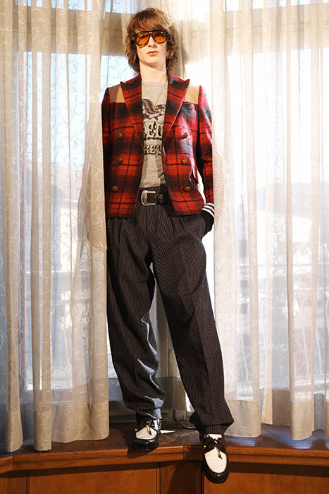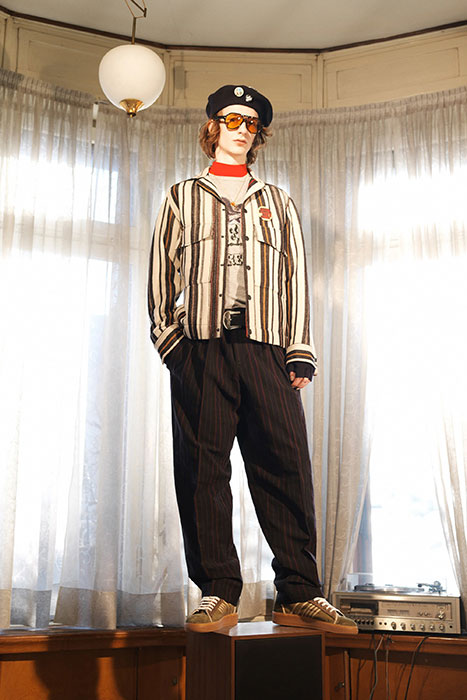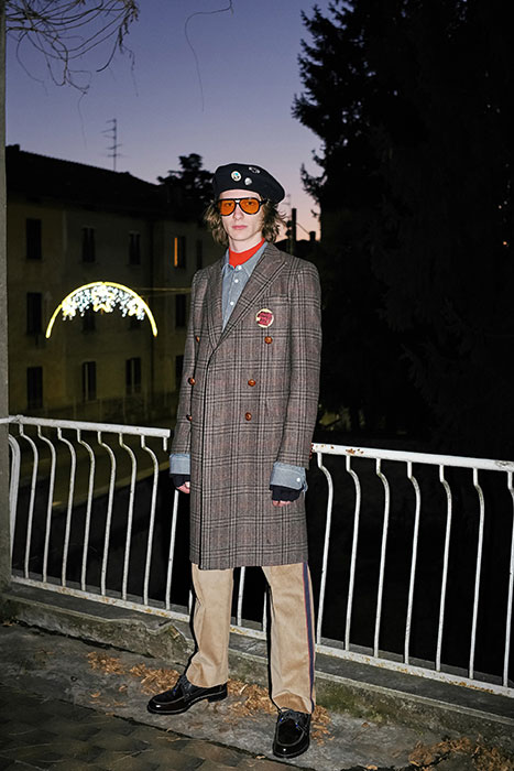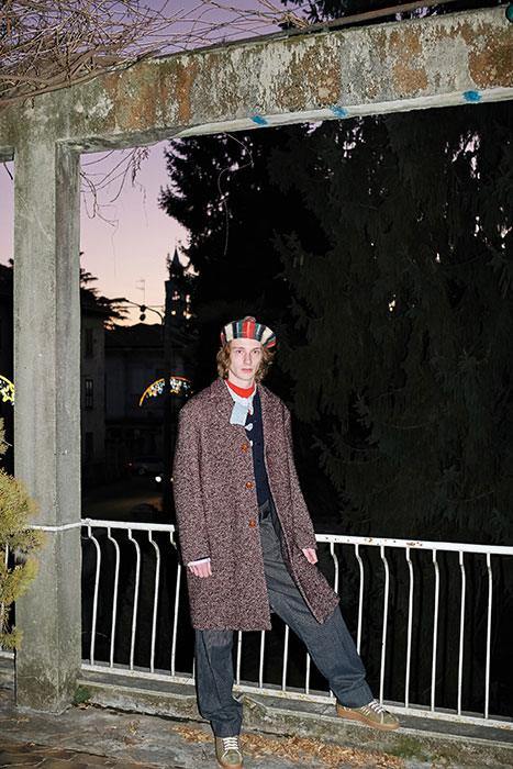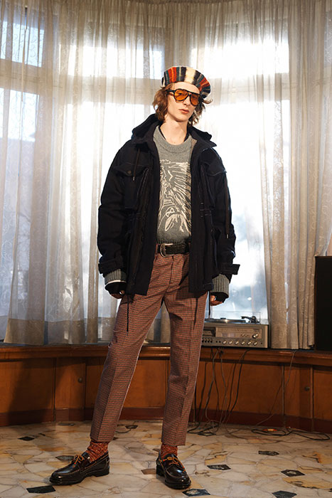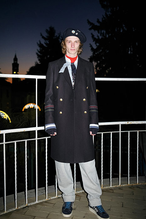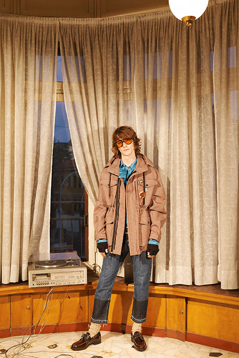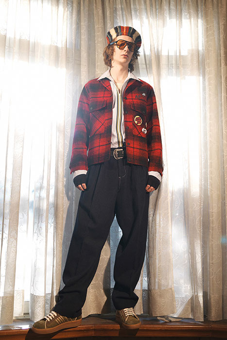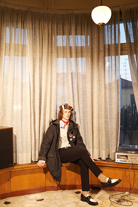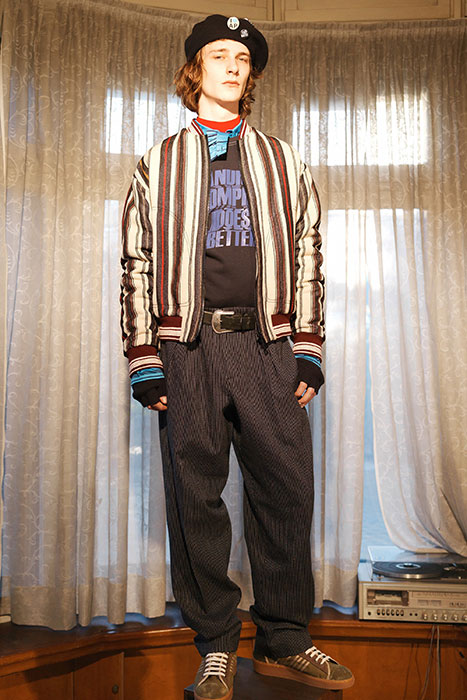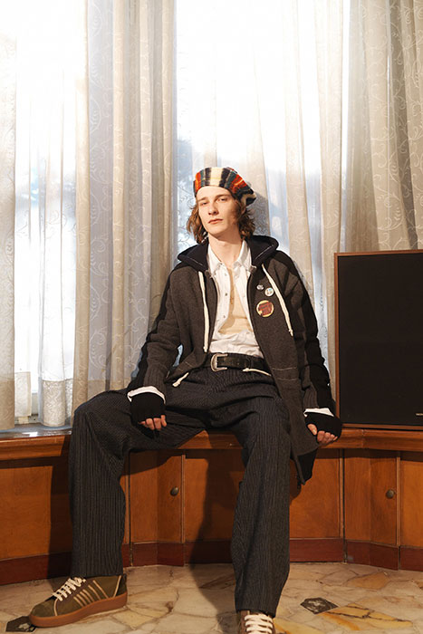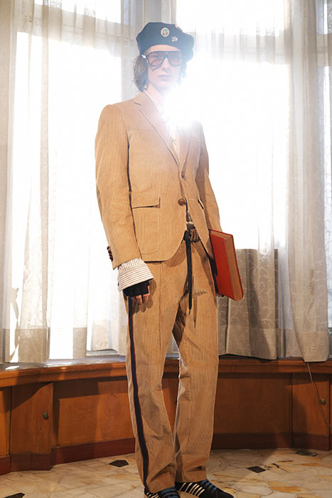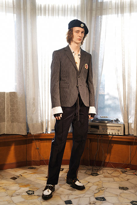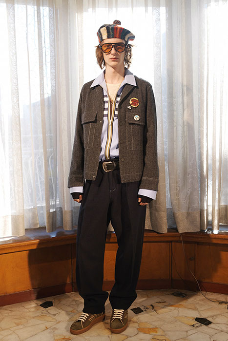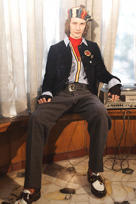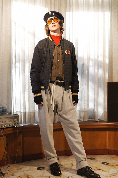 Тренд на винтажный гардероб, возрожденный Алессандро Микеле в Gucci, актуален как никогда. Andrea Pompilio не только использует образы студентов из 70-х (крупные очки с оранжевыми стеклами, яркие береты), но и уделяет особое внимание тканям (велюр, деним). Необычные стилистические приемы добавляют коллекции колорита: значки как на униформе американских бойскаутов, мокасины на носки крупной вязки, высоко подвернутые штанины и манжеты рубашек, напротив, высвобожденные из рукавов. Чем не герой фильма Уэса Андерсона?