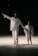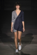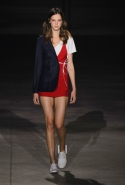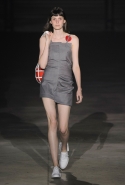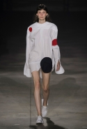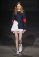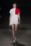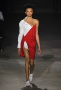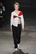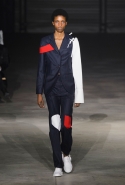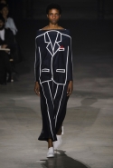 На этот раз все выглядело сырым и будто сделанным наспех: водолазки без рукавов, натянутые на модель поверх ее рук, не к месту прицепленные галстуки, покосившиеся пиджаки, не слишком старательно переделанные в платья, косо и криво сшитые платья-комбинации. И даже чистые простые краски, которые использует Жакмюс, темно-синий и красный, белый и черный, положения не исправляют: прежней жизнерадостности здесь нет. Если раньше та же недоделанность, очевидная асимметрия казались имитацией очаровательной безалаберности и беспечности юности, то сейчас дизайнер, кажется, говорит о тоске, когда будущее неопределенно и все валится из рук. Исчезает это ощущение только тогда, когда на подиуме появляется наш любимец Сол Госс в костюме, просто нарисованном белой краской поверх темно-синей робы в тонкую-тонкую полоску. Особенно иронично выглядит красный треугольник, в рисунке играющий роль носового платка, по-джентльменски хранимого в кармашке на груди.