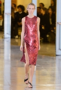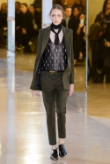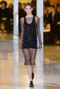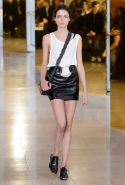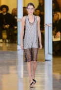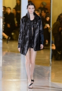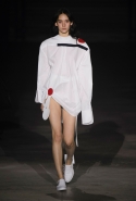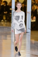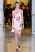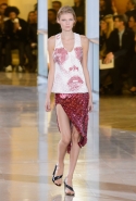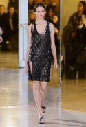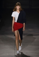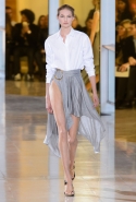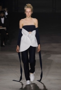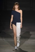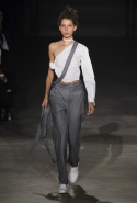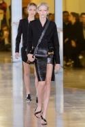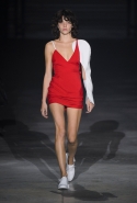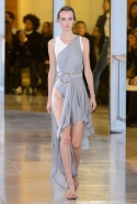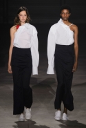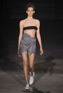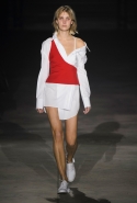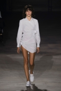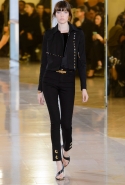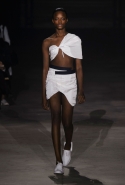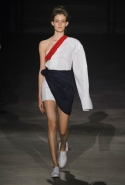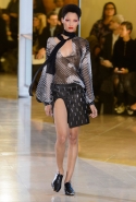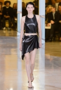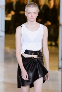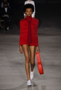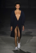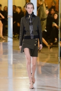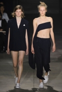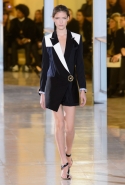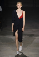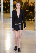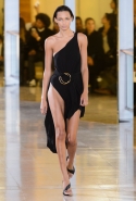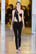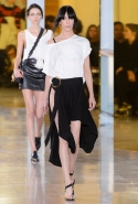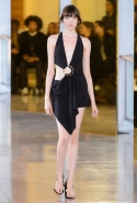 Главными звездами коллекции, безусловно, стали именно те самые асимметричные юбки, не просто демонстрирующие миру нижнее белье моделей, но и делающие его своей частью. Держались на теле они, кажется, только благодаря крупным металлическим кольцам, на которые и были собраны мелкие складки драпировок. Эти же кольца собирали воедино и разрезанные надвое (то есть на топы и юбки) черные платья. Запомнилось нам и то, как Ваккарелло обыграл пиджаки, превратив их в такие же сексуальные мини-комбинезоны.
