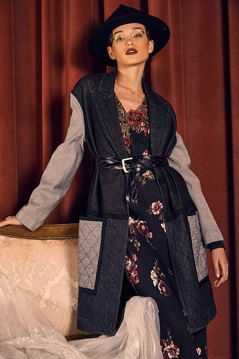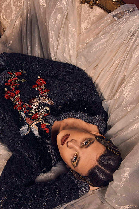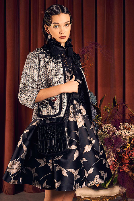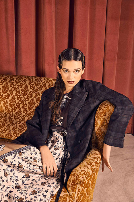 Стилистика лукбука выдержана соответствующая: леопардовый принт на одежде и обуви, много кружева, бархата и мех. Прически и мейк-ап выполнены в стиле 60-х. Аксессуары тоже с приставкой ретро: фетровые шляпы, длинные перчатки и косынки (цветочные или совсем китчевые — из пластика). Цветовая палитра — в темных оттенках коричневого, серого и золотого.