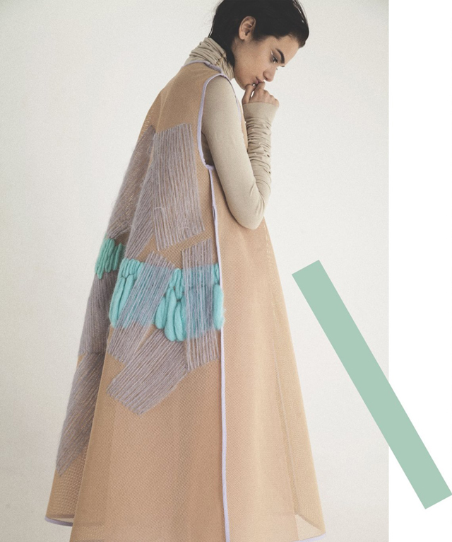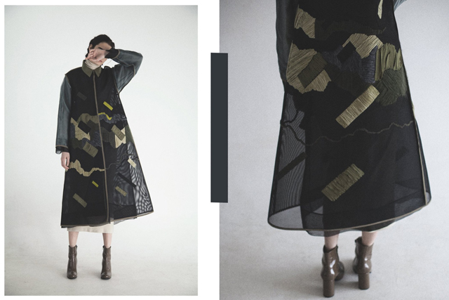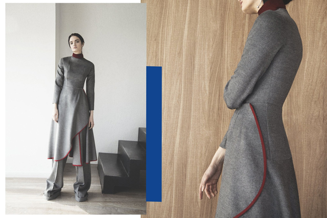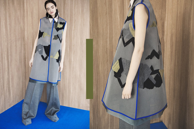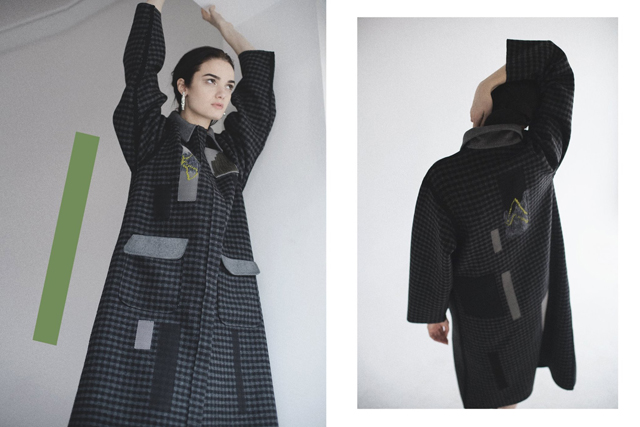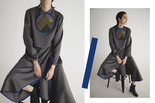Пользуясь приемами японского графического дизайнера, дизайнер грузинский так же заполняет блоки сплошного серого цвета маленькими деталями — вышивками в виде аккуратных геометрических фигур, рассыпающихся по полам пальто. Из маленьких квадратов, треугольников и графичных размашистых линий Бокучава складывает и свои любимые пейзажные зарисовки, которые так или иначе возвращаются в каждой его коллекции: здесь и вписанные в круг на груди горные вершины, и вышитые на юбках континенты.