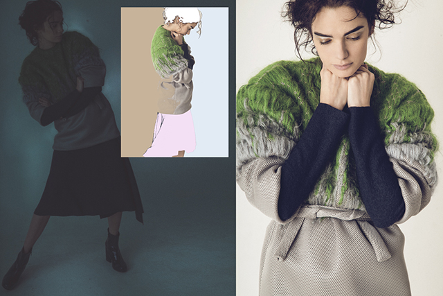 Главным источником вдохновения, по словам дизайнера, для него стали работы Эрнста Людвига Кирхнера, немецкого живописца начала прошлого столетия. Краски в новой коллекции Atelier Kikala, впрочем, куда скромнее тех, что использовал художник: Кирхнер работал на контрастах, выбирая самые яркие, резкие, не щадящие глаз случайного зрителя цвета. Бокучава же берет за основу нейтральные тона, — серый, черный, бежевый и землисто-коричневый, — а цвет играет в коллекции роль главного (по значению, но не по занимаемой площади) акцента. Поэтому на пальто и платьях появляются пейзажные вышивки из мохеровых нитей: ярко-зеленые деревья, голубые и белые горы и красное небо.