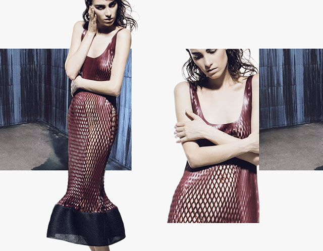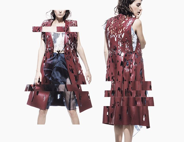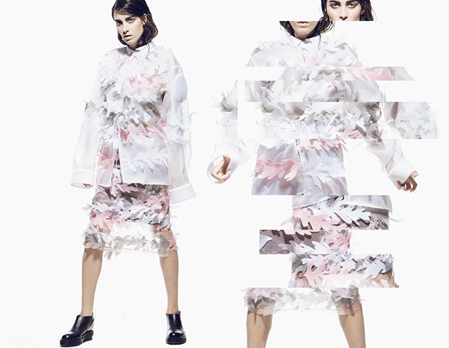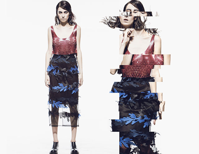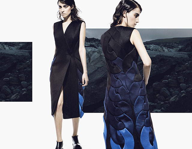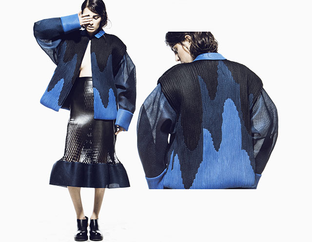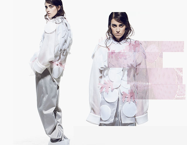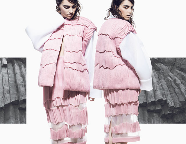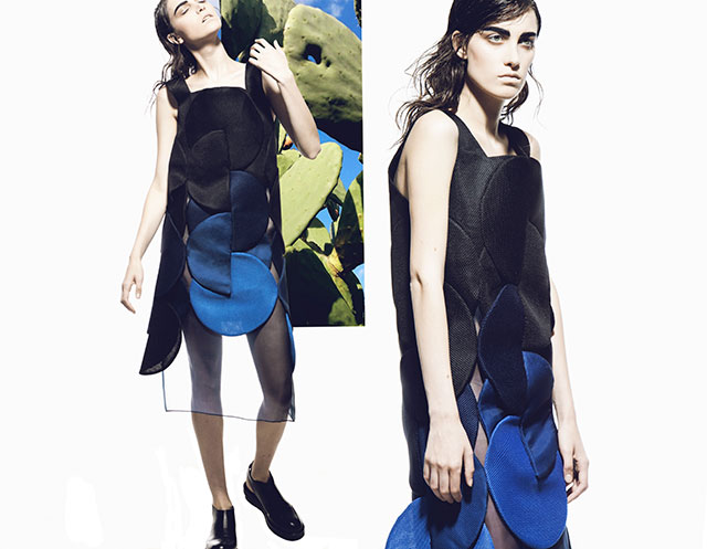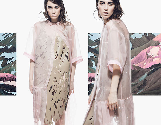 Дизайнер использует геометричные, минималистичные силуэты и формы, постепенно заполняя их шаблоны органическими фактурами. Прямо из конструкций костюмов выступают, словно сквозь асфальт и пластик, мелкие листочки и побеги, объемные блузы покрываются похожими на облака тканевыми наростами, а цветные разводы и волны, которые казались бензиновыми, являются графичными копиями горных пейзажей. Природа как будто пробивается сквозь строгий порядок, выстроенный руками человека, доказывая, что укротить и сломить ее все-таки невозможно. И то, что выглядело высокотехнологичным и оторванным от нее, вдруг становится органическим, земным, сдаваясь под ее постепенным наступлением.