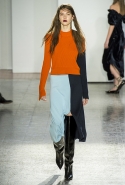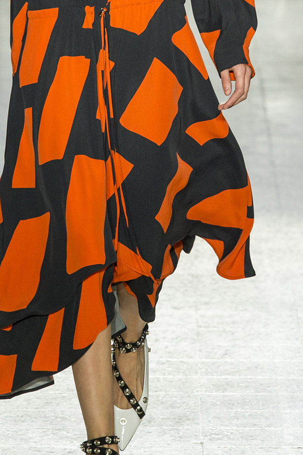 Стайлинговые приемы: супрематические паттерны, ботфорты под цвет платья, приспущенные комбинезоны, рубашки, заправленные в брюки на высокой талии, подвернутые рукава, водолазки под свитерами и рубашками