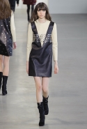 В этот вечер на подиуме представили всего две длины, не признавая «золотой середины»: если мини, то до бедра, если макси, то до щиколотки. Подчинялись этому негласному правилу все вещи без исключения, от комбинезонов, платьев и юбок до верхней одежды. Коротенькие платьица и тренчи с крупными круглыми пуговицами прямиком из 60-х соседствовали с длинными простыми платьями с легкой отделкой из кожи и точащими по подолу нитками (вот она — достойная альтернатива навязчивой бахроме) и прямыми брюками. А фестивальный расслабленный стиль Коста приспособил к современным реалиям, воспользовавшись техникой пэчворк и собрав и плащи, и топы, и юбки, и целые брючные костюмы из полос кожи и замши разных оттенков.