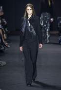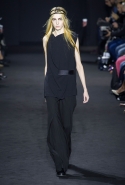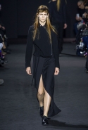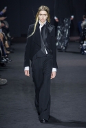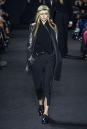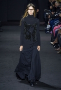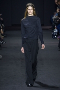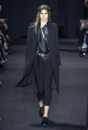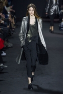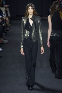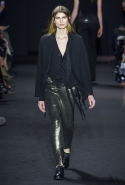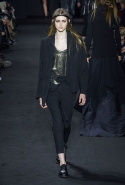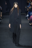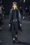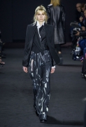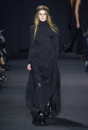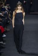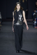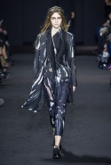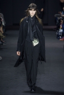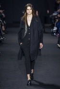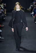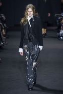 Что бы ни говорили о всесильности черного цвета, который даже человека, одевающегося без фантазии, превратит в икону стиля, сделать коллекцию в одном только черном интересной и эффектной — задача, близкая к невыполнимой. Себастьян Мюнье, креативный директор Ann Demeulemeester, зная об этом, за такую задачу браться не стал. И total black все же разбавил металликом, золотым тиснением и абстрактными размытыми принтами в тех же сине-черных тонах. Эти предметы он нарочно запрятал в многослойных образах так, чтобы они не бросались в глаза слишком очевидно: блестящие жилетки, например, выглядывают из-под объемных плащей или просторных жакетов только при движении. Ну а серебристые плащи он маскировать и прятать не стал: скрыть их было бы, как ни старайся, уже решительно невозможно.