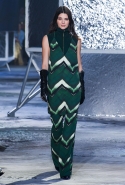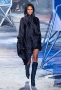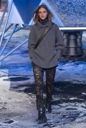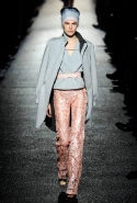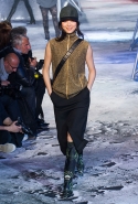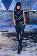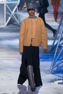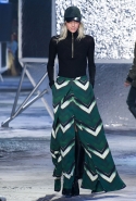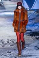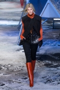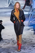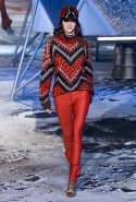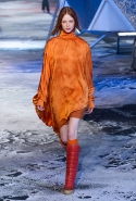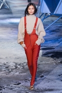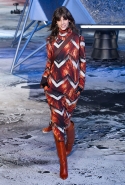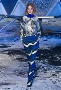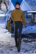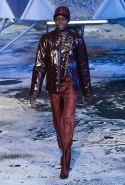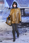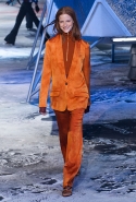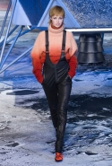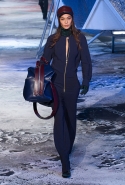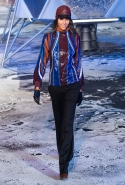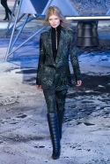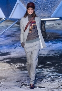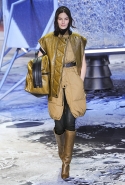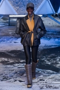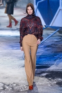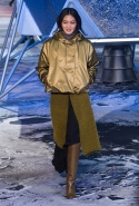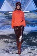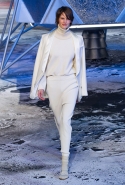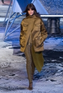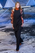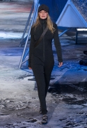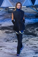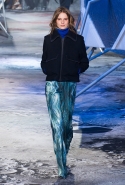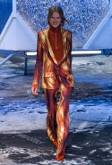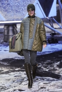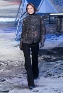 Покорительницам космоса достались соответствующие наряды — футуристичные, но вполне приспособленные и к повседневной жизни на нашей родной планете. Комбинезоны астронавтов, замшевые брючные костюмы, лаковые куртки, расшитые блестящими камнями свитера, лаковые юбки, вещи с огненными принтами и люрекс — космос оказался ближе, чем мы думали. Но особенно хорош был один из пуховиков, составленный из блоков цвета хаки и серого, простеганных по разному рисунку — клеткой, как обычно, и паркетной елочкой двух размеров.
