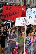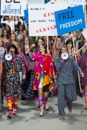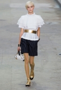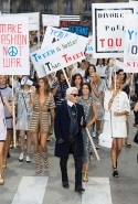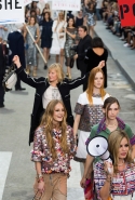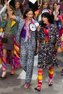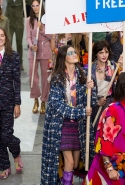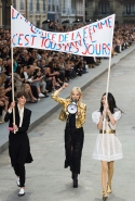 Сегодня о правах каждого, кто готов сражаться не только и не столько за честные выборы, но и за обширный выбор аксессуаров, напомнил всем Карл Лагерфельд. Grand Palais он на несколько часов превратил в парижский бульвар, по которому прошла мирная, но довольно шумная и крайне пестрая демонстрация. Девушки вышли на подиум с плакатами-манифестами, а возглавила их шествие с громкоговорителем в руке, конечно, лидер Chanel tribe Кара Делевинь. Лозунг "Каждой женщине — по паре балеток Chanel!" нам разглядеть не удалось, зато "Пусть мужчины тоже вынашивают детей", "Занимайтесь модой, а не войной" и "Будь своим собственным стилистом" к сведению мы приняли. Подписываемся!