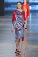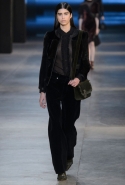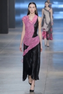 Сияние жидкого металла, разливающегося по плиссированным юбкам, соседствовало с озорным блеском глиттера и сдержанным мерцанием черного бархата, материалы плотные и тяжелые — с прозрачными и невесомыми, а самые темные тона — с сочными и словно наэлектризованными. Невероятную энергию шоу передавали и резкие ломаные линии, зигзаги молний, ставшие одним из главных декоративных элементов осенней коллекции. А цветные аппликации в виде резных девичьих силуэтов, украшающие платья и юбки и издалека кажущиеся лишь крупными красочными пятнами, стали второй главной изюминкой показа.