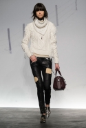 Обращается Виверс и к еще одной исконно бунтарской истории, связанной с байкерами прошлого — то есть со старыми добрыми ковбоями. Дикий Запад он воспринимает не слишком буквально, без штанов с лампасами и ковбойских шляп. Зато складки ворота свитера крупной вязки ложатся точь-в-точь как лихо повязанный вокруг шеи платок. На кожаных брюках красуются большие коричневые заплатки, а из того свитера торчат пышной бахромой нитки.