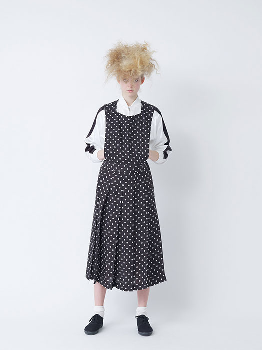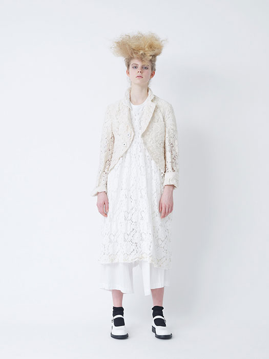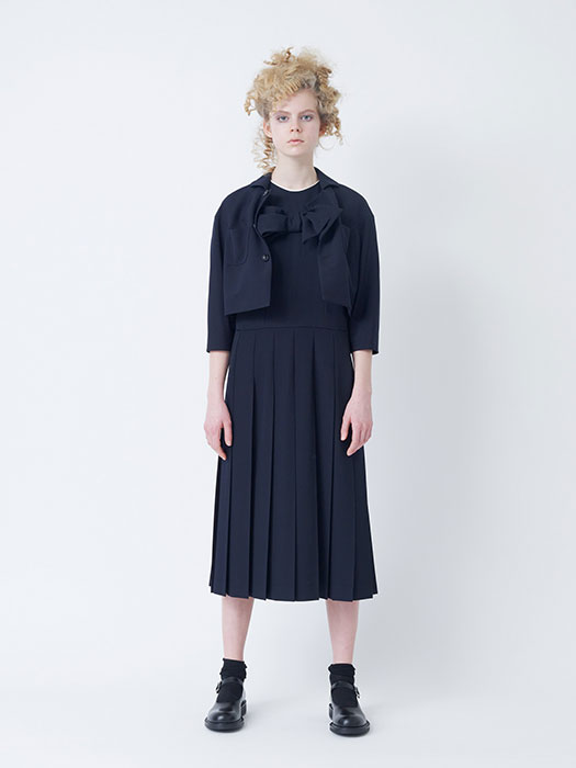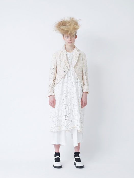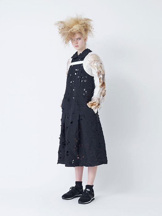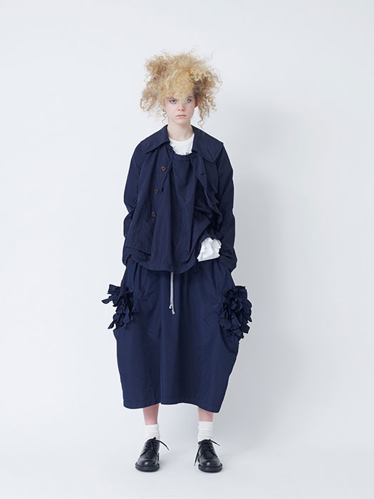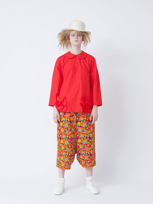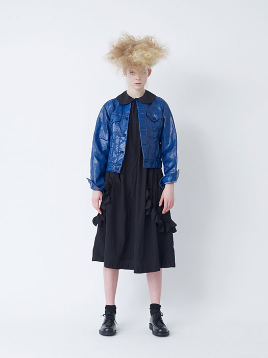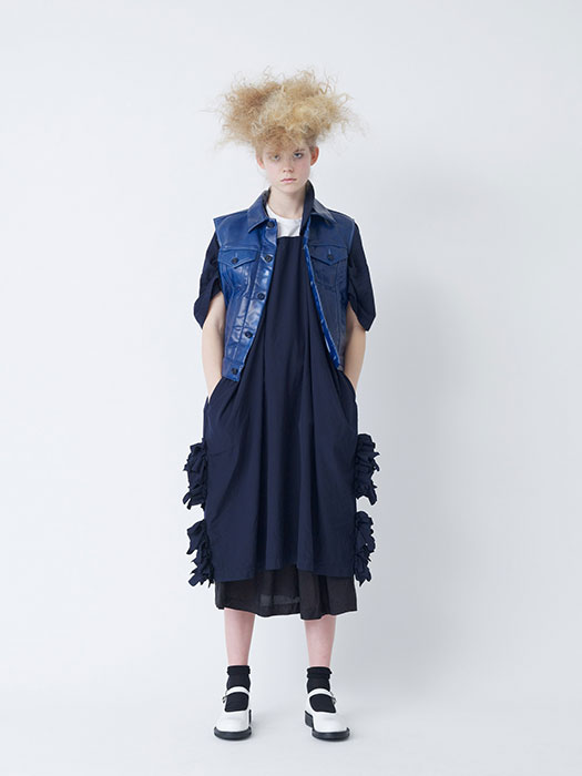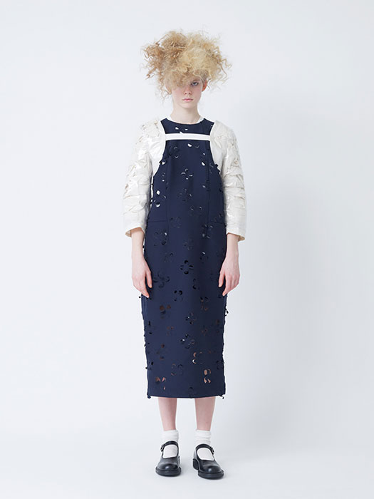 Образы лукбука отдаленно напоминают школьную форму, но на новый лад: куртки с двойными воротниками, разного рода подтяжки на многослойных юбках, защипы для придания складкам объема, укороченные брюки, кружевные рубашки, платья с отложными воротничками и бантами на шее. Коллекция построена на базовых цветовых сочетаниях (синий, черный и белый) с ярким цветочным принтом в качестве акцента.