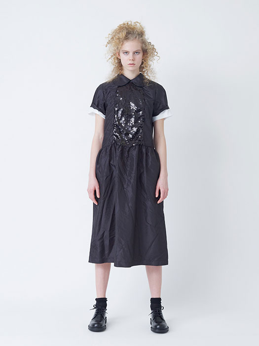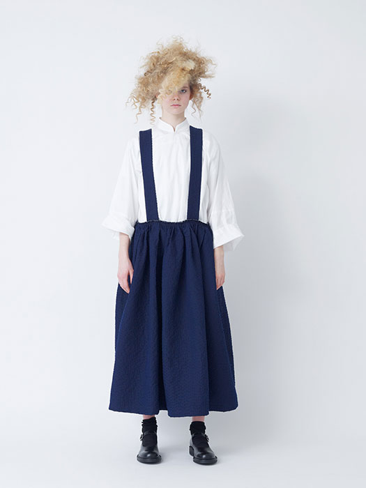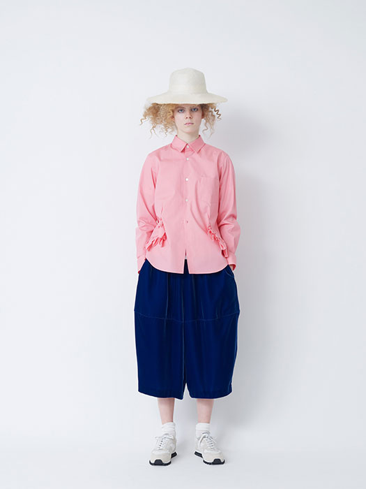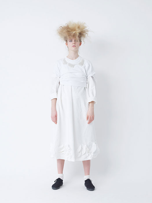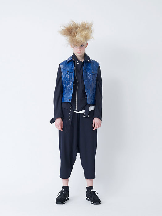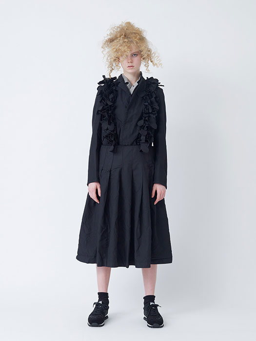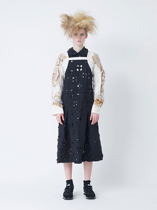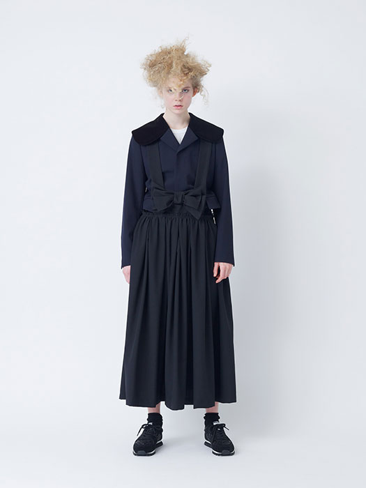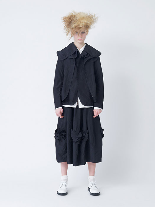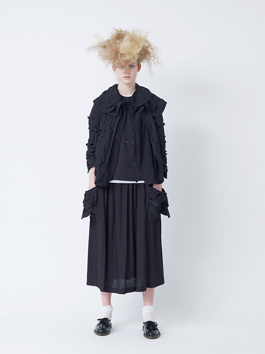 Образы лукбука отдаленно напоминают школьную форму, но на новый лад: куртки с двойными воротниками, разного рода подтяжки на многослойных юбках, защипы для придания складкам объема, укороченные брюки, кружевные рубашки, платья с отложными воротничками и бантами на шее. Коллекция построена на базовых цветовых сочетаниях (синий, черный и белый) с ярким цветочным принтом в качестве акцента.