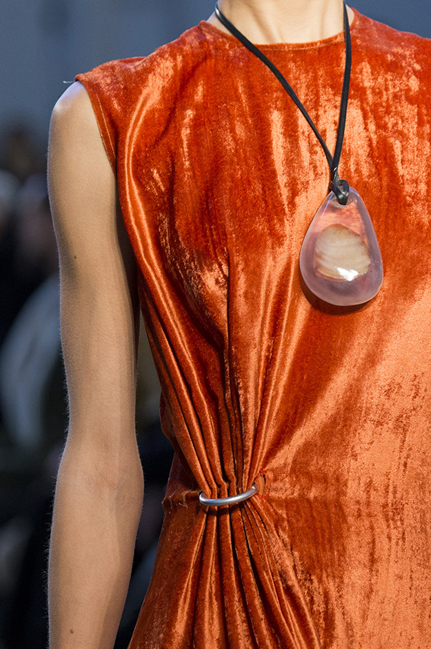 Аксессуары: длинные кожаные ремни, камни, залитые прозрачной смолой в качестве украшений, очки в круглой оправе