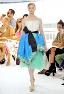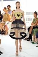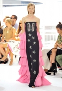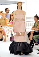 Результатом его творческих поисков и на этот раз стала сказочная коллекция, полная нежных и пышных объемов, сложных деталей и необычных конструкций. Тему традиционных испанских оборок (или «Цыганских баллад») Фонт все-таки затрагивает, но совсем в духе танцовщиц фламенко — танцевать что-то кроме вальса в таком наряде было бы непросто. Самой яркой иллюстрацией этого стало большое, пышное платье в нежно-нежно-розовом и черном цветах. Оборки на нем не кружевные и легкие, а из того же материала, что и основная часть, — плотные и держащие форму, превращающие не в нежный цветок или пирожное, а в произведение высокой архитектуры.