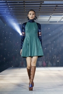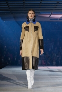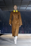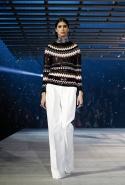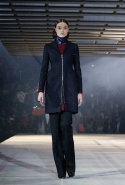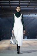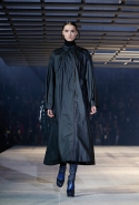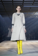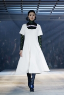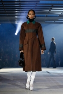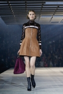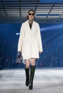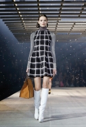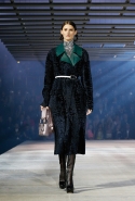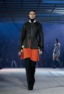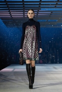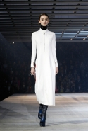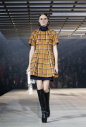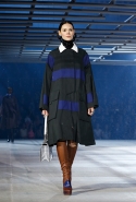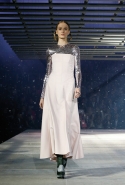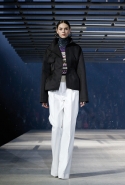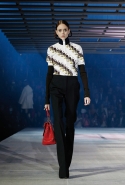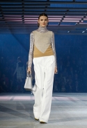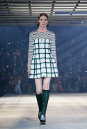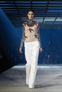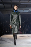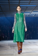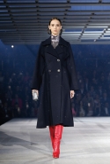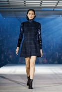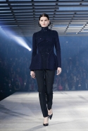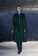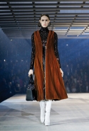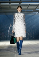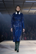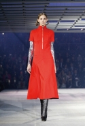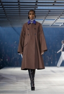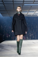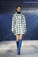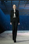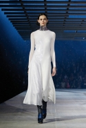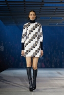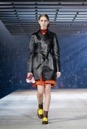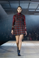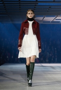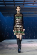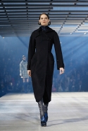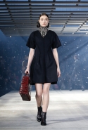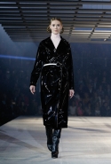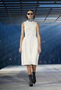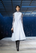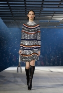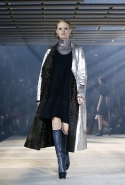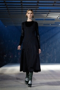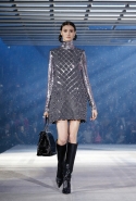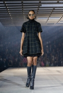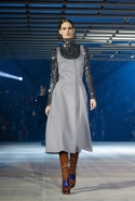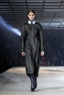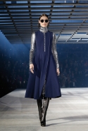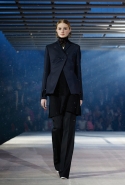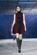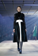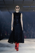 Коллекция Рафа Симонса получилась такой же: местами неприглядной, местами сияющей серебристым блеском пайеток, местами по-своему гламурной, местами — по-военному грубой. Знаменитые bar jackets разрастаются до полноразмерных глухих пальто, растеряв в процессе всю свою обычную элегантность, а пальто к финалу превращаются в мрачные лакированные робы, напоминающие дождевики. Другие девушки выходят на подиум в школьных клетчатых платьях, мини-платьицах, усыпанных пайетками, и серебряных космических куртках. А самые отчаянные и вовсе надевают поверх серебристых водолазок, покрытых сияющими стразами, старушечьи вязаные жилетки. Они похожи на школьниц, рассчитывающих после учебы сбежать на какой-нибудь межгалактический рэйв, — солнечные очки, от которых пришел бы в восторг любой российский подросток 90-х, как будто намекают именно на такой поворот событий. А вслед за этими космическими сиротками появляются на подиуме и совершенно загадочным образом оказавшиеся в такой компании девушки в каракулевых пальто или меховых длинных жилетах. И вся вместе эта блестящая толпа напоминает жителей разных условных "дистриктов", собранных в зале совершенно случайным образом для участия в очередных "Голодных играх".