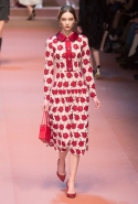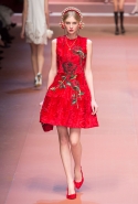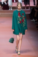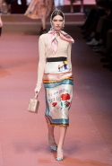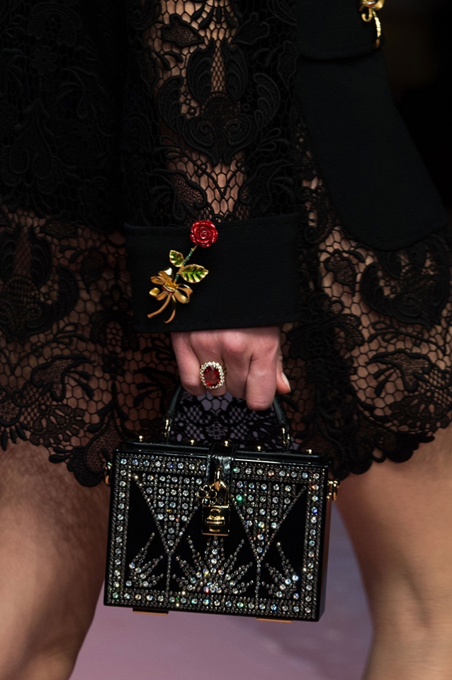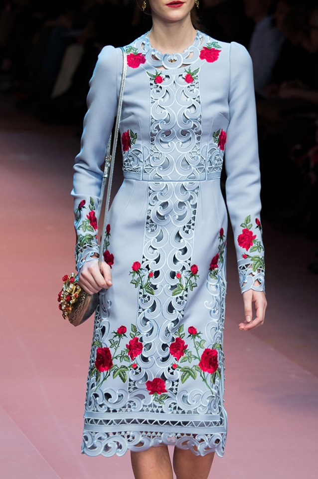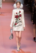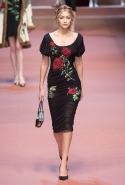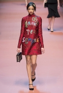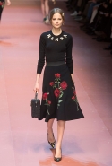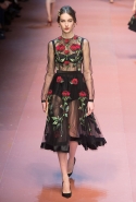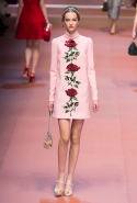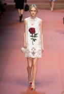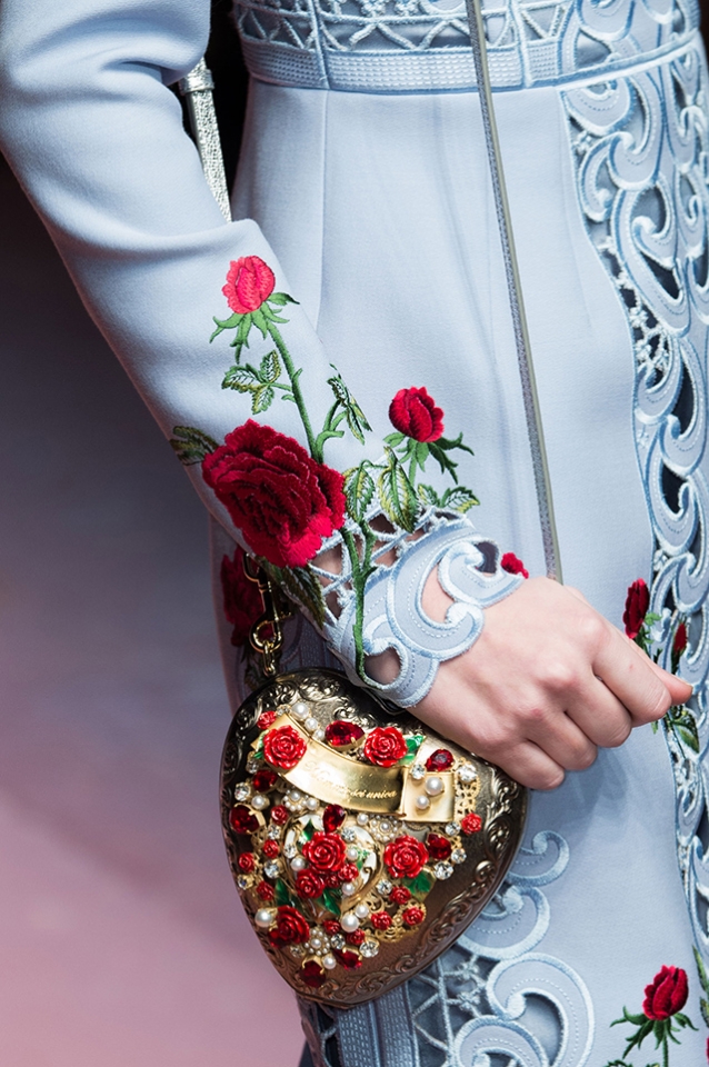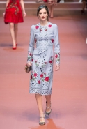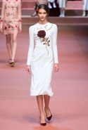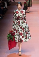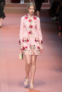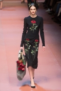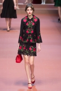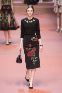Главным символом новой коллекции стала красная роза — это и цветок, который принято дарить мамам в День матери (до которого, кстати, осталась всего неделя), и важное воспоминание для половины дизайнерского дуэта. По словам Стефано Габбаны, запах розы ассоциируется у него с детством — в точности так пахла красная помада его собственной любимой мамы, которой та пользовалась по особенным случаям. И именно поэтому у всех помад, выпускающихся под маркой Dolce & Gabbana в наши дни, такой сильный запах. Сияющие красные розы с расшитыми камнями лепестками и золотистыми стеблями украшают и платья, и блузы, и юбки, и пальто из новой коллекции — где-то в виде принтов и аппликаций, а где-то даже в виде фигурных пуговиц.