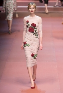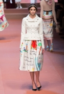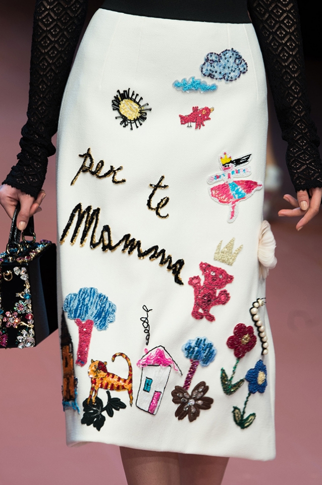 Но не только «розовый» мотив стал для Дольче и Габбаны очень личным. Доменико Дольче взял рисунки своих маленьких племянников и племянниц и использовал их в качестве основы для принтов и вышивок. Так что платья, которые кажутся разрисованными детской рукой, такими и являются. А вам приходилось когда-нибудь в детстве портить любимое мамино платье, решив украсить его собственным творчеством? В новом сезоне ругать ребенка за такое не стоит. Мода, начатая Анджелиной Джоли и ее свадебным платьем, разрисованным детьми семейства Джоли-Питт, кажется, продолжается.