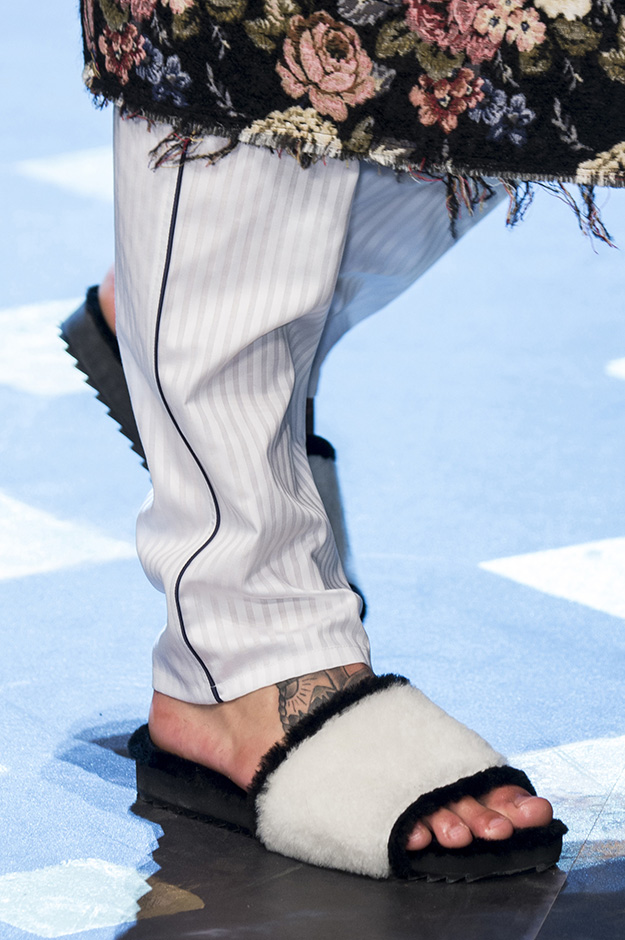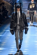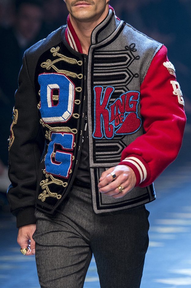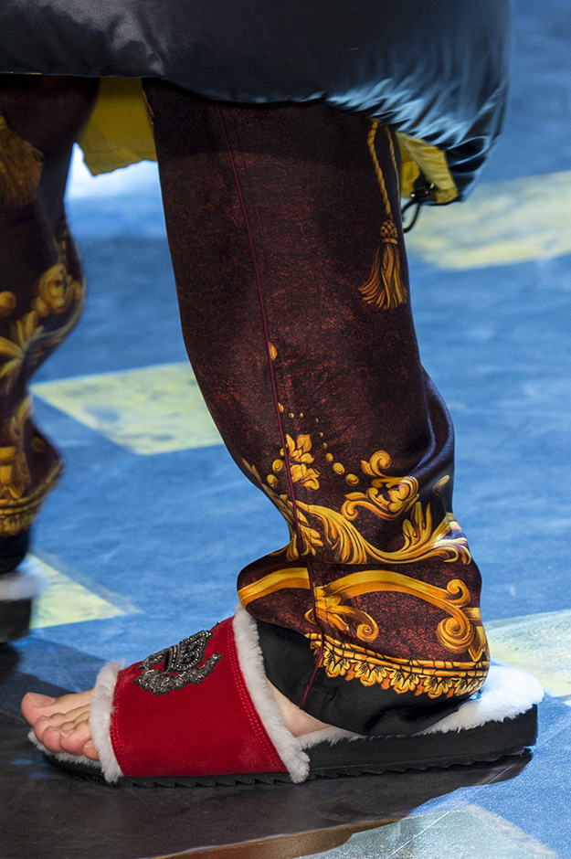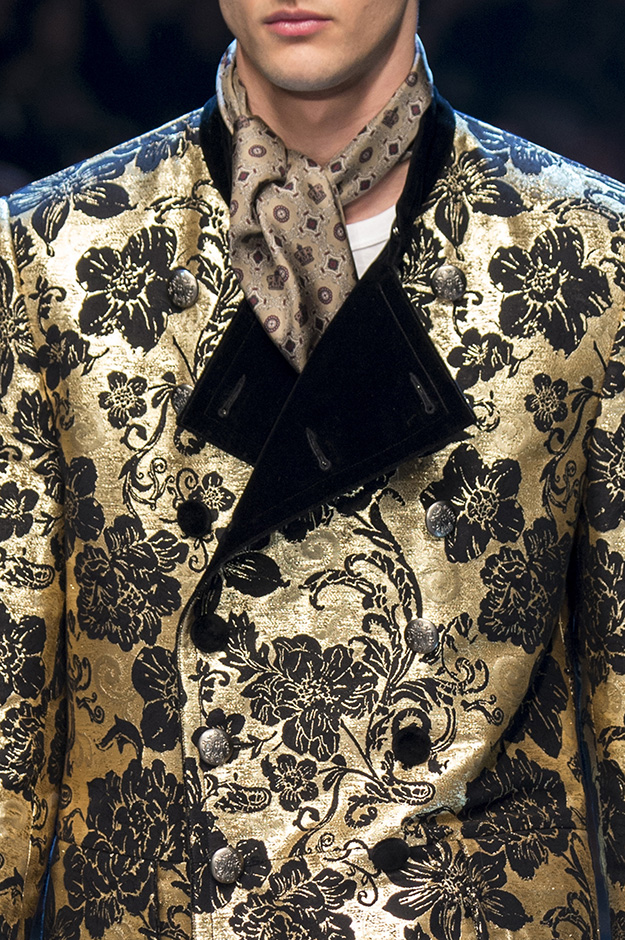 Основные элементы: мужские костюмы и смокинги из царственной парчи, золоченые ткани и военные мундиры, свитера с принтом, объемные пэчворк-пуховики против длинных пальто, стеганые бархатные домашние халаты