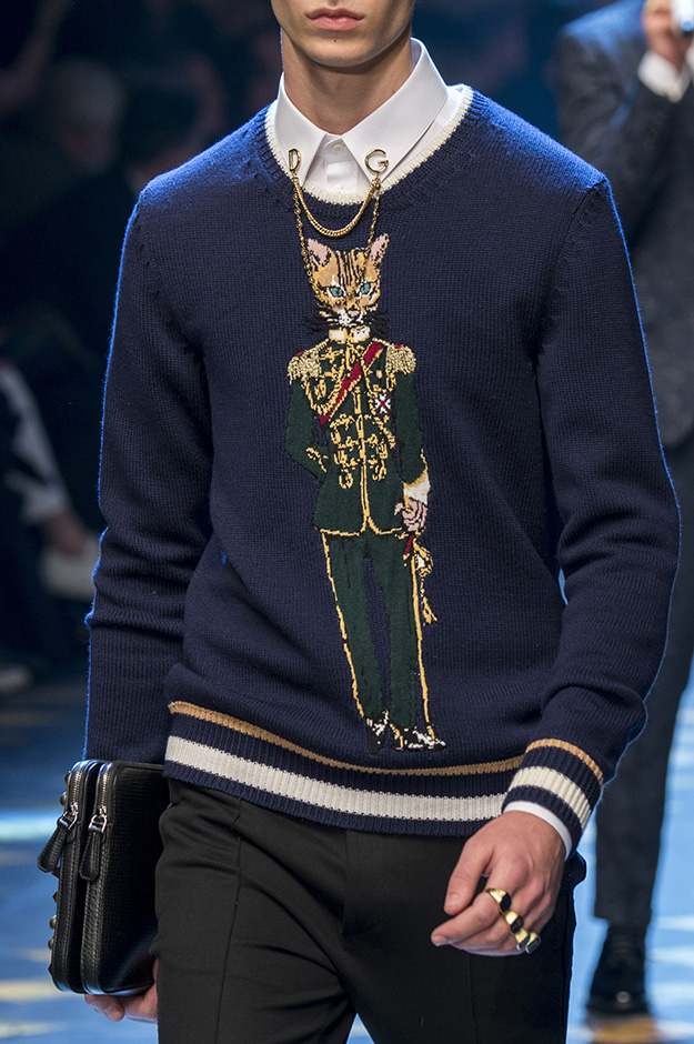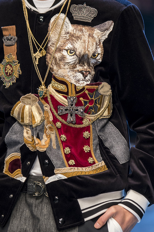 Стайлинговые приемы: военный мундир как элемент молодежной одежды, золотые апплике, носки с тапочками из меха, комбинация нескольких принтов, кошки, волки, львы и короны