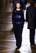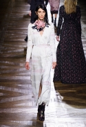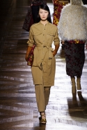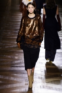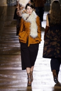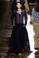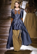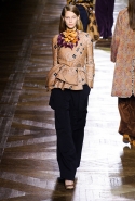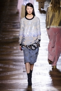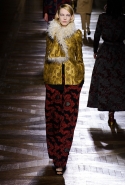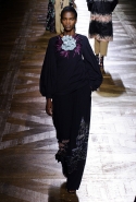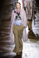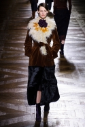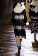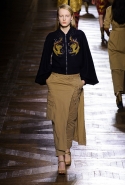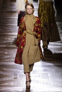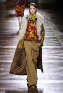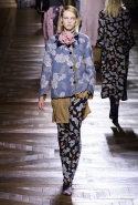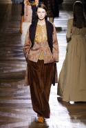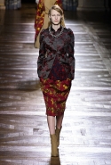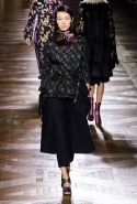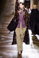 Стеганые плащи, восточные халаты и платья, жакеты и юбки в цветах, шубы разной степени потрепанности и перьевые оторочки, грубый хлопок, линялый и ставший пастельным камуфляж, тускло мерцающий бархат и жаккард с выгравированными позолоченными рисунками, крупные пайетки и искусственные цветы — все смешалось сегодня на подиуме. Кажется, что свою осенне-зимнюю коллекцию бельгийский дизайнер Дрис Ван Нотен не рисовал в студии и не отшивал в ателье, а собирал по кусочкам по винтажным магазинчикам и блошиным рынкам. Поэтому и широкие «военные» брюки оказываются моделям не по размеру и лишь кое-как подпоясаны, чтобы удержаться на узких бедрах.