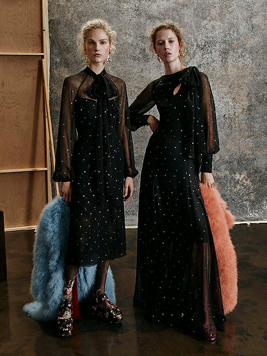 Коллекция преимущественно состоит из платьев. Компанию им составляют брючные костюмы-двойки, жакеты, бомберы, блузы с бантами, джемперы и разноцветные пушистые жакеты из пуха марабу.