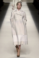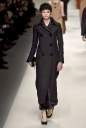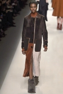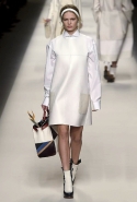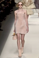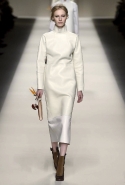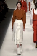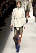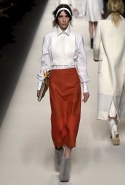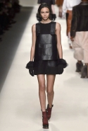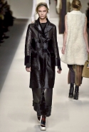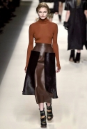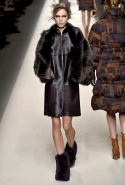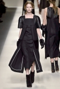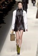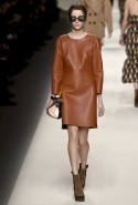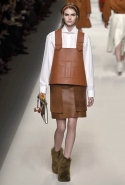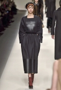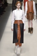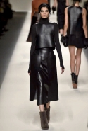 Одним из главных материалов в новом сезоне, помимо традиционного для Fendi меха, стала кожа. Из нее команда Fendi сшила и стоящие колоколом платья-рубашки, и топы, и сарафаны, которые кажутся больше похожими на технические чертежи, чем на вещи, которые в принципе могут поступить в магазины, — даже карман на груди кажется не настоящим, а только чуть намеченным. Еще интереснее смотрятся кожаные юбки и кюлоты с нашитыми по бокам огромными прямоугольными панелями.