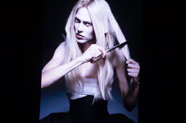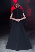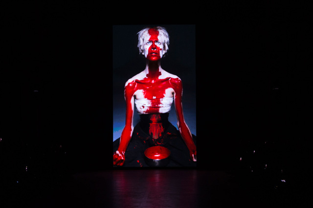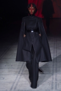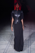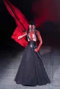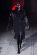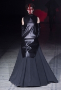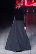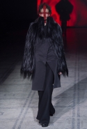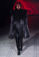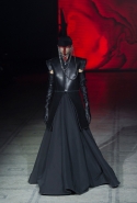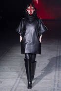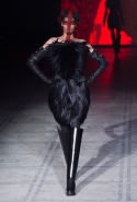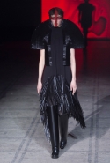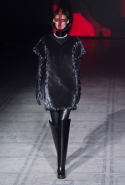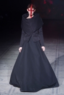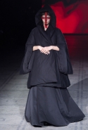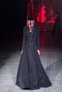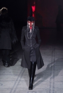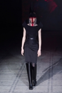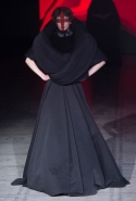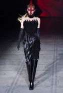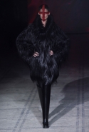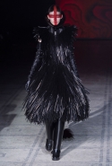 Ностальгия по Англии чувствовалась и в осенне-зимней коллекции, которую гости недели моды увидели сегодня. Огромную меховую шапку, в точности как у лондонского караула, было видно, наверное, из всех уголков зала — а серебристые металлические цепи, поддерживающие ее на подбородке, он прикрепил и к другим головным уборам собственного авторства. Но сама коллекция, впрочем, была не английской, а совершенно интернациональной: Пью взялся за две вечные темы — любовь и войну — и решил рассказать о них с помощью одного только цвета — черного. А на лицах девушек-моделей нарисовал не то краской, не то кровью огромные красные кресты с пугающими подтеками. Особенно эффектно этот «кровавый» ход смотрелся в финале, когда на подиум вышла модель с кроваво-красным флагом в руках, разрисованная практически полностью.