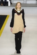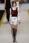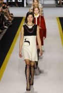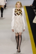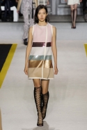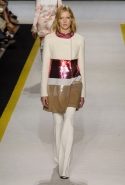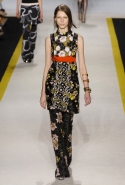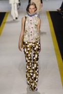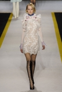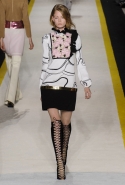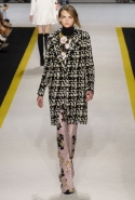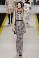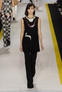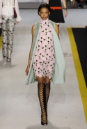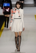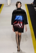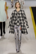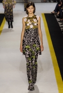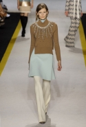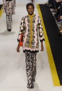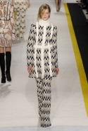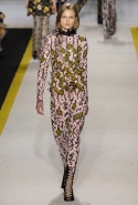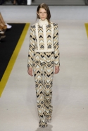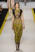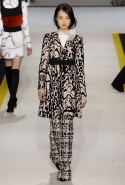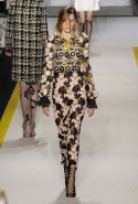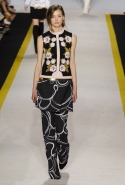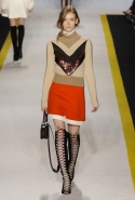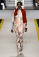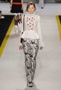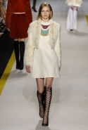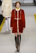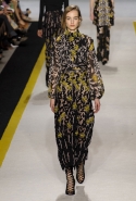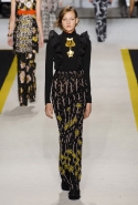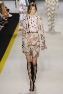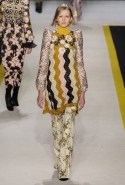 Возвращается он и к контрастным графичным принтам, и к 3D-отделке, только на этот раз место бахромы занимают широкие меховые полоски, а к фактурным цветочным аппликациям добавляются кружевные объемные «косички» и много-много пайеток. К лаконичным линиям и силуэтам 60-х Валли добавляет богемную беспорядочность 70-х, меняя весеннюю легкость на осеннее богатство текстур, большее разнообразие густых сплошных принтов и теплые «земные» цвета. Появляются в коллекции даже «гладиаторы», ставшие обувью № 1 в весенне-летнем сезоне, — тогда Джамбаттиста Валли решил их не делать, нарядив моделей в легкие черные лодочки и босоножки, а теперь собрался с мыслями и все же выпустил собственную версию актуальной модели. Разумеется, со скидкой на сезон — в его осенне-зимней версии это легкие сапоги до колен с высокой шнуровкой.