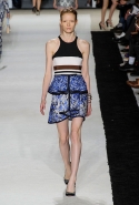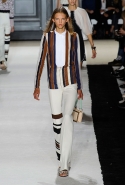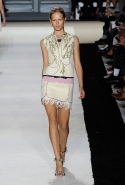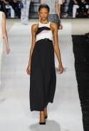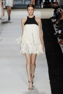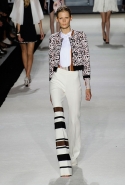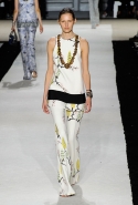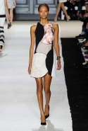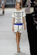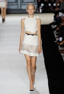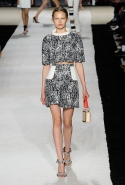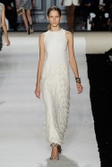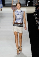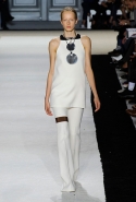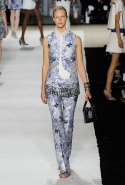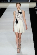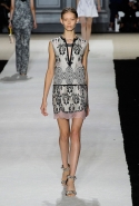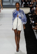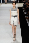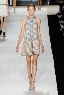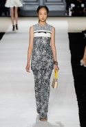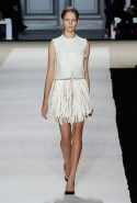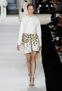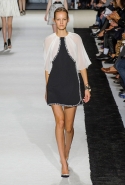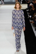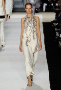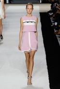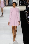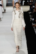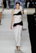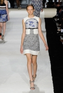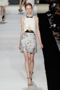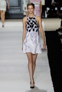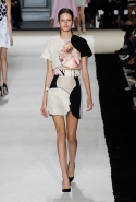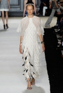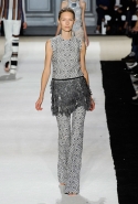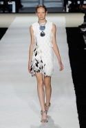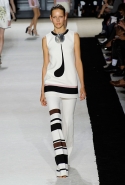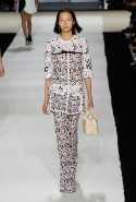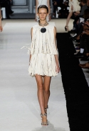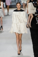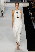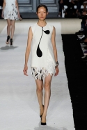В этот раз он, например, отказывается от любимых и им самим, и его клиентками цветочных каскадов и платьев-букетов, делая ставку на новые разработки ученых. Он берет знакомые силуэты 60-х годов, платья-трапеции и брючные костюмы, и применяет к ним 3D-эффект. Платья, хотя это всего лишь простые мини А-силуэта, кажутся объемными, как компьютерные модели. Все благодаря сложным комбинациям черно-белых графичных блоков с округлыми краями и вставок-окон, покрытых digital-принтами. Игры с формой и пространством продолжаются и дальше — иллюзии помогают создать густые занавеси бахромы, геометричные узоры пастельных расцветок, кружево и объемная отделка из тканевых "листьев".