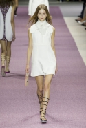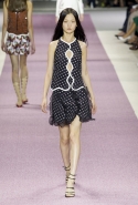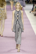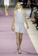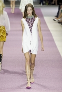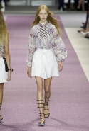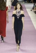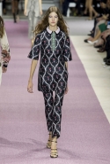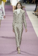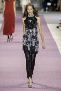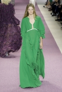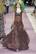 Большая часть коллекции вновь покрыта растительными узорами, но довольно мелкими и ненавязчивыми — рисунки по цветам напоминают скорее аптечные иллюстрации, чем привычную пестроту цветочных принтов. Зеленый здесь не яркий, а слегка приглушенный, и вторит ему такой же деликатный сиреневый. В той же гамме выполнены и вышитые на белых платьях скромные букеты — эти легкие платья особенно хороши и выглядят очень свежо и юно. И в них куда больше очарования, чем в тех платьях в пол, которыми Валли завершает шоу, — оборки, вырезы и графичные цветы, нарисованные нарочито неестественно, кажутся грубыми и недостаточно изящными.