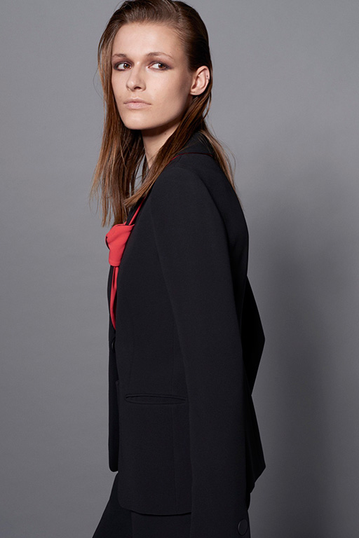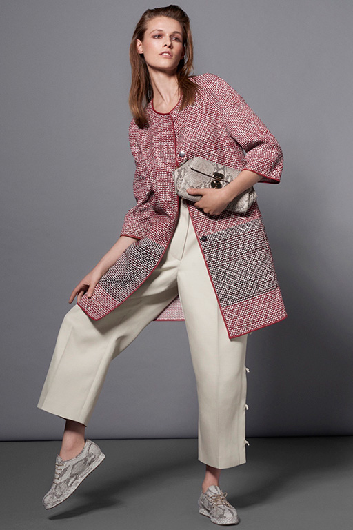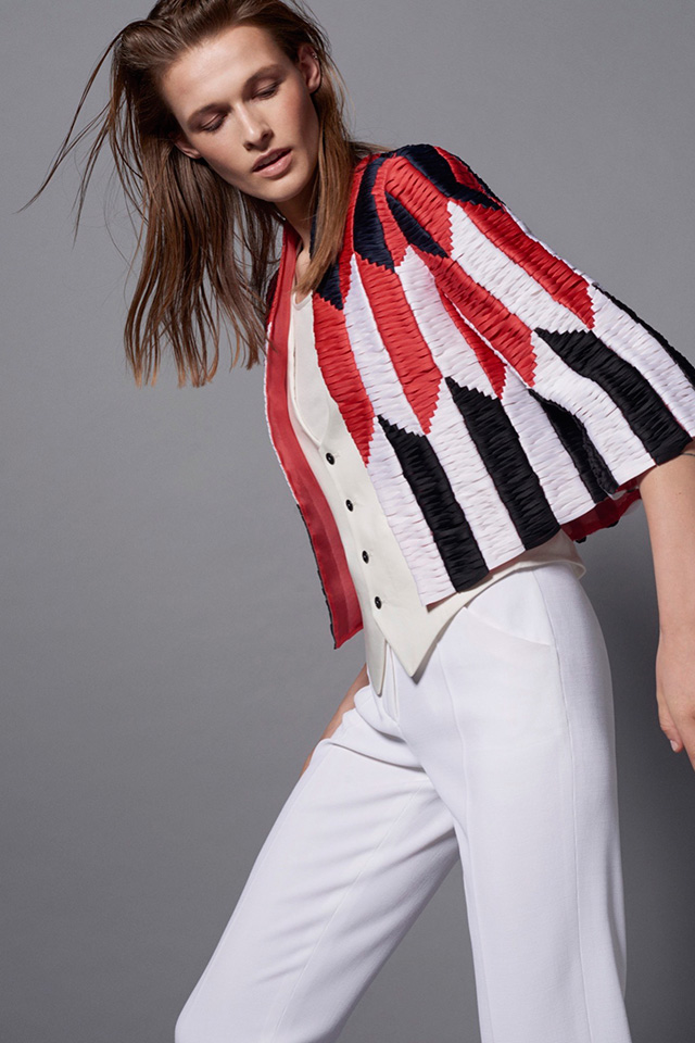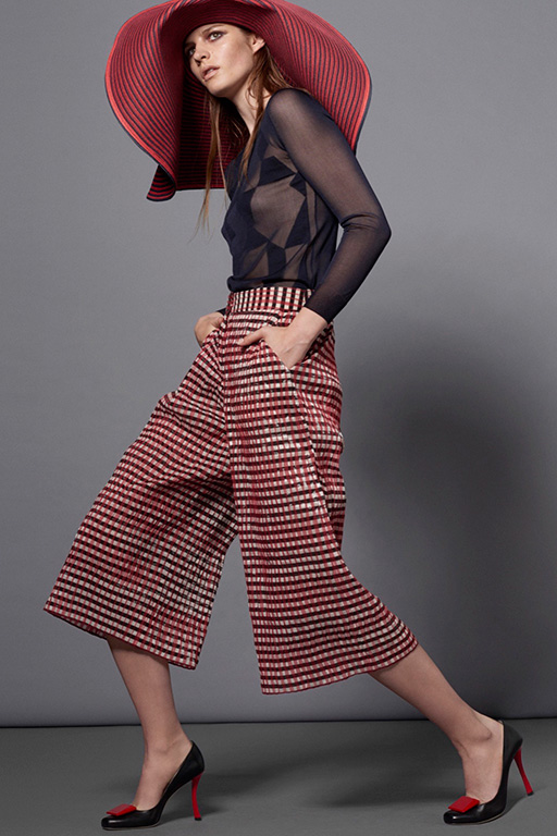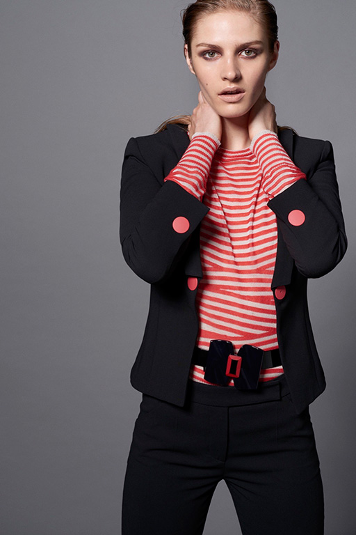 Решив столкнуть традиционную морскую тему, которая постоянно возвращается в круизных коллекциях, с Азией, Джорджо Армани сделал интересный ход. И ни одна из его вещей, которые сами по себе максимально просты по силуэтам, не выглядит очевидно. Бело-синяя гамма, привычно ассоциирующаяся с летом, морем и свежим морским ветром, полностью заменена на абсолютную свою противоположность, черно-красную. Тельняшки покрываются черными и красными полосками, капитанские жакеты моментально чернеют, привлекая внимание яркими акцентами — крупными красными пуговицами, а ближе к концу эти два цвета объединяются с белым, чтобы дизайнер мог рисовать уже тремя красками объемные графичные узоры.