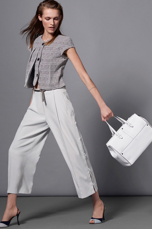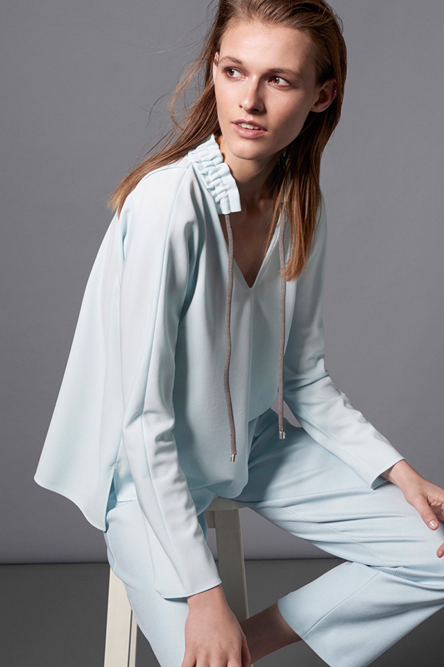 Впрочем, во второй половине коллекции (а поскольку образов всего 17, ждать приходится недолго) настроение ее резко меняется. И вновь на главенствующие позиции возвращается любимый цвет Джорджо Армани, синий, в самых разных оттенках: от электрического и яркого для тренча до нежно-голубого для летних костюмов.