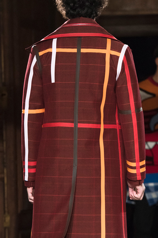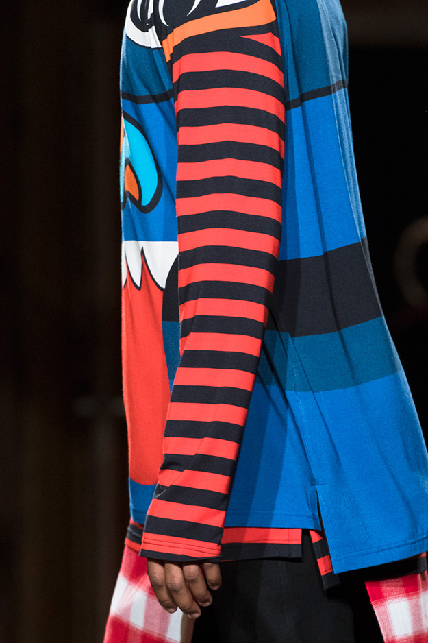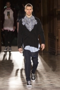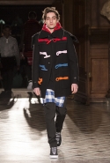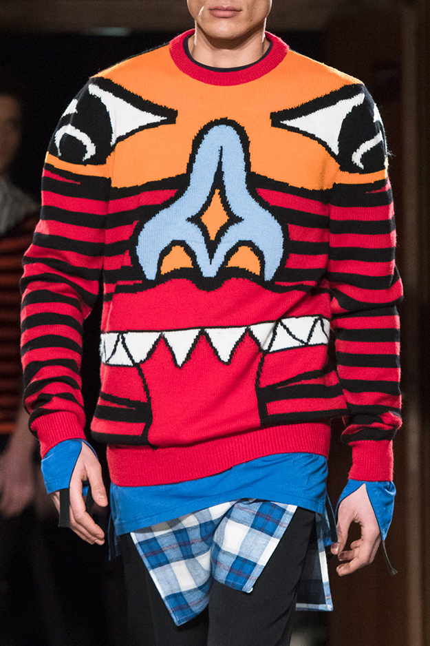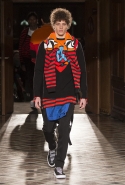 Основные элементы: «инфантильные» рубашки, майки, свитера и пуховики, «взрослые» пиджаки и строгие пальто, вечерние платья в женской части коллекции