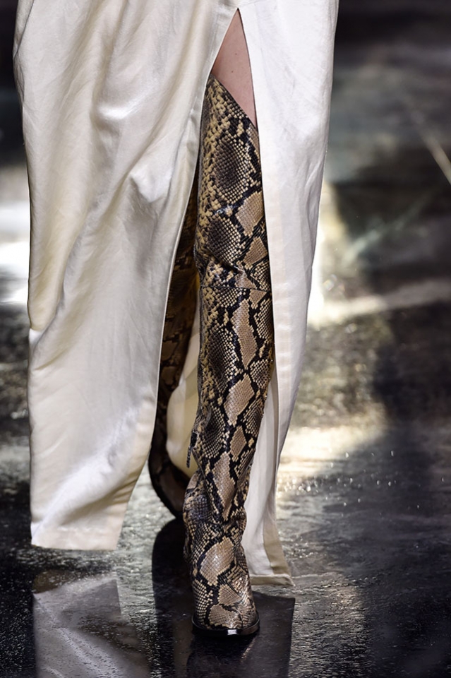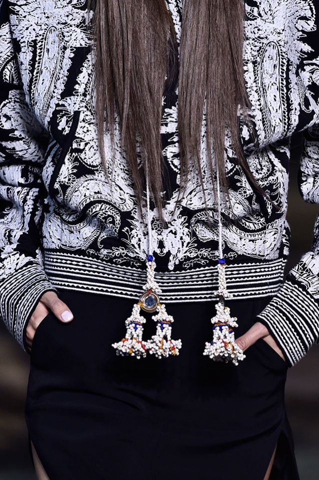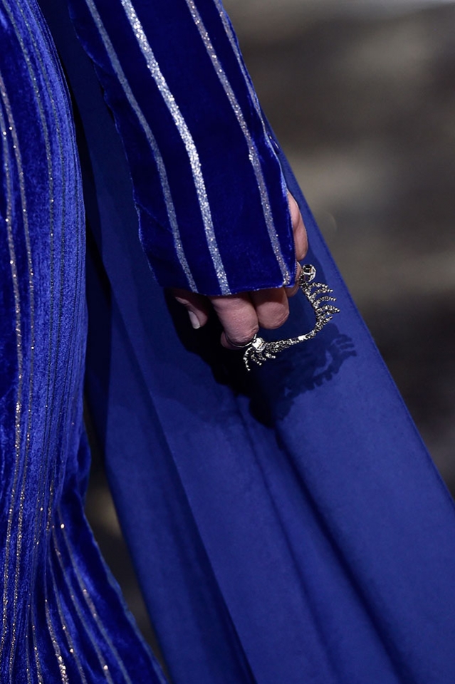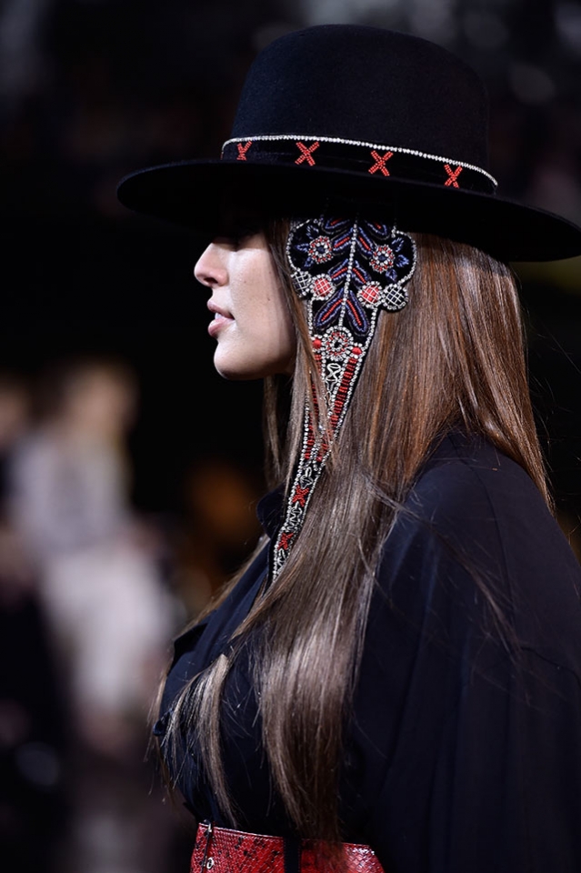 Саму же коллекцию, несколько отодвинутую на задний план из-за звездного модельного состава, можно без сомнений назвать удачной. В ней команда дизайнеров решила объединить сразу два образа: странницы, путешествующей по миру в поисках вдохновения, и девушки, только-только поднявшейся с постели. И главными предметами одежды, вокруг которых строится все, стали поэтому просторные плащи-палатки, джентльменские (то есть в данном случае немного old fashioned) брючные костюмы с широкими брюками и обязательными шляпами, а также пижамы — они-то самые разные, пожалуй, и стали звездами этого шоу. И даже бархатные и замшевые вещи с цветочными вышивками, очень нарядные и броские, или искусственная лакированная кожа, раскрашенная под змею, не смогли обойти их в битве за наше внимание.