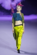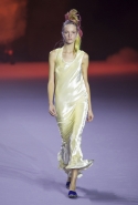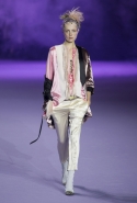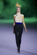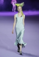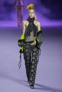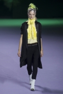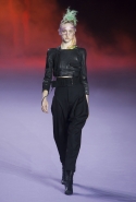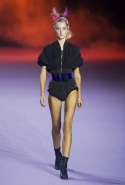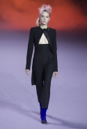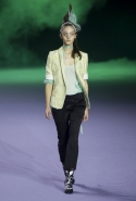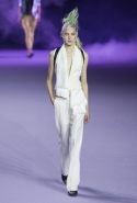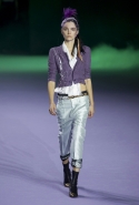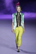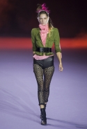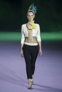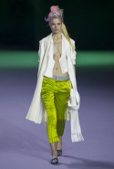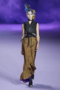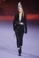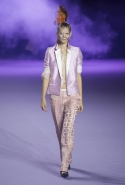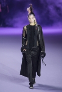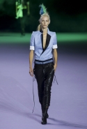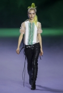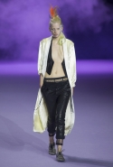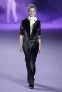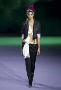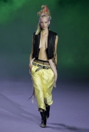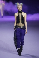 На этот раз коллекция Хайдера Акерманна вышла не рок-н-ролльной или роковой, а скорее рейверской. Но не для тех поклонников техно, которые носят только черный и ничего, кроме черного, а для других, которые не имеют ничего против цвета и, скажем, кислотных прядей в волосах или каких-то совсем безумных пестрых причесок. Одежда тоже соответствующая. Главным предметом коллекции однозначно становятся брюки с низкой посадкой, атласные или кожаные, непременно сужающиеся книзу и почти незаметно переходящие в изящные полусапожки на смешном низком каблуке. К брюкам и сапожкам идут, как правило, распахнутые жилеты, не подразумевающие того, что под них будет надет еще и топ — и действительно, зачем? Самым простым и запоминающимся ходом, который из этой коллекции можно взять на заметку, станет как раз сочетание тех самых брюк с низкой посадкой и торчащих из них колготок, натянутых до самой талии, — на словах звучит не слишком убедительно, но выглядит эффектно.