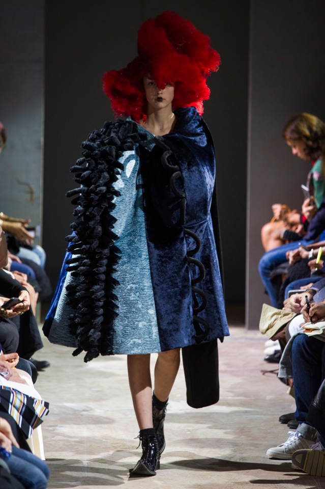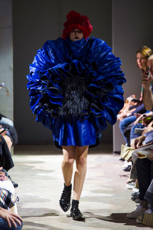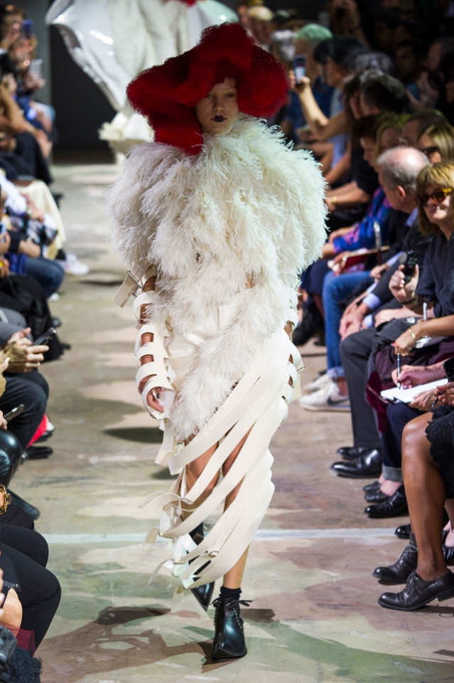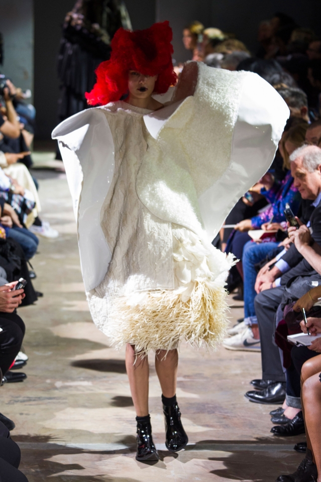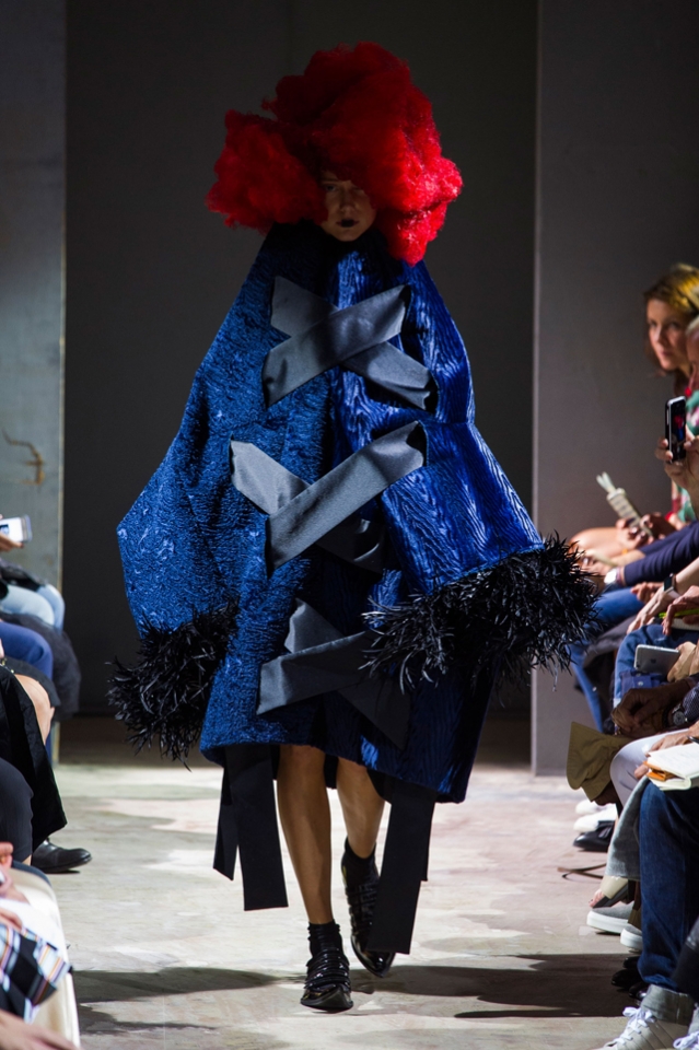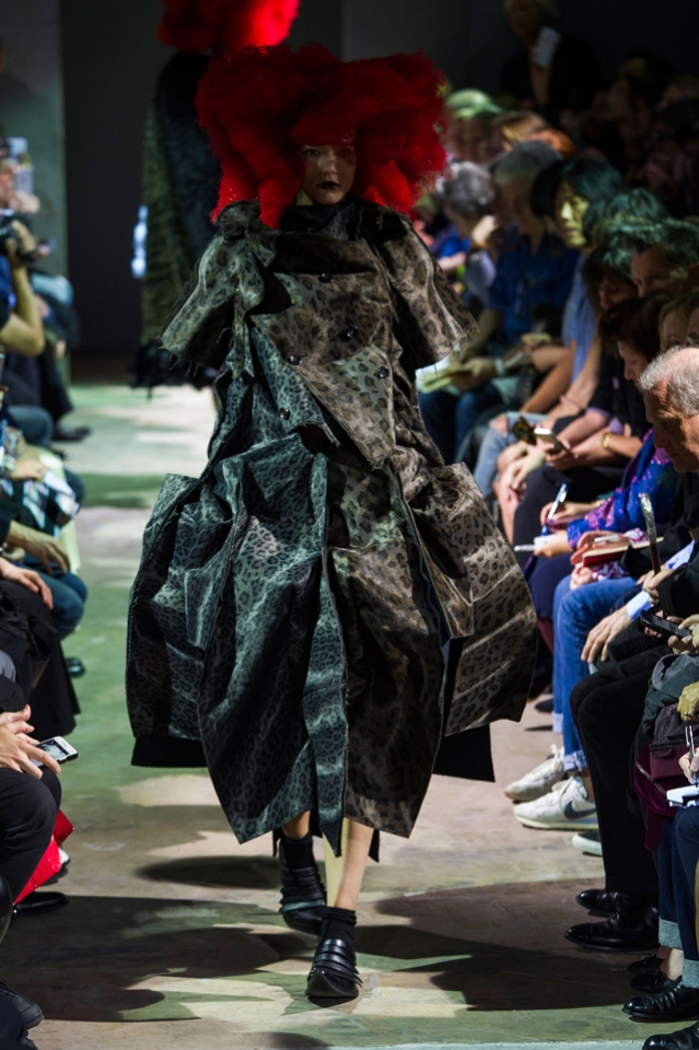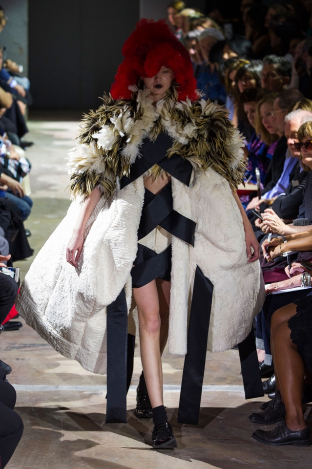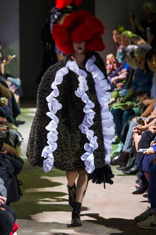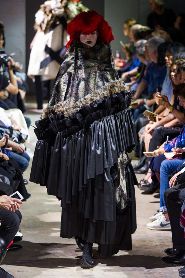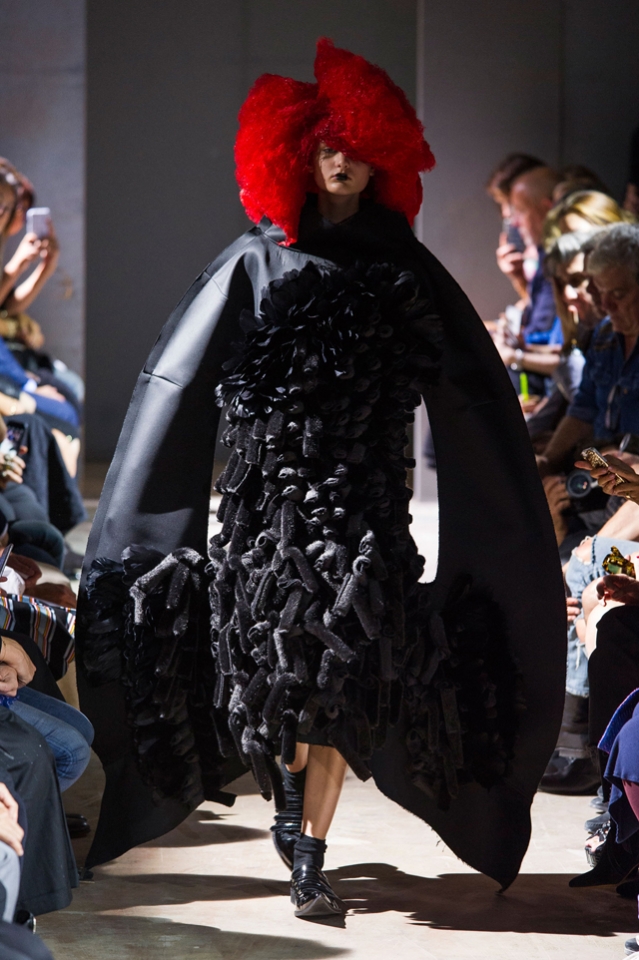 Огромные бесформенные наряды Comme des Garçons на этот раз казались похожими на кляксы. Но сама Рей Кавакубо подразумевала их как фантазию на тему ведьм — и действительно, в некоторых плащах из шнурков и оборок, особенно черных, казалось, виднелось что-то от наряда Гингемы из Страны Оз. Из оборок, перьев и километров ткани команда марки по-прежнему создает удивительнейшие вещи, которые с подиума должны отправляться сразу в музей.