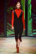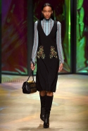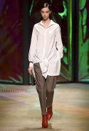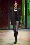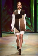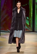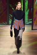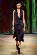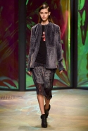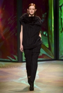 Героиня новой коллекции Донны Каран, как всегда, современная обитательница шумного Нью-Йорка, которая выходит из дома на работу, чтобы вернуться к утру, пробежавшись по барам и всем заметным вечеринкам. И одевается она соответственно: выбирает черно-белую гамму, разбавляя ее отдельными вещами и аксессуарами ярких тонов. Собственно, эти слова идеально и полностью объясняют все, что мы увидели сегодня на подиуме. Брючные офисные костюмы и "уличные" шорты, свитшоты и выглядывающие из-под них полупрозрачные юбки, свитера и брюки — вещи вполне базовые и достаточно спокойные выполнены в черных и серых цветах. А дополняют их неожиданные яркие вставки: эту роль могут взять на себя коралловые штаны или электрически синее пальто, платье-коллаж из кусочков ткани разной расцветки и фактуры, объемная шуба с густой бахромой или выложенный пайетками узор на рукаве в остальном максимально сдержанном сером плаще. Но чаще всего Каран ограничивается одной только полоской, расшитой блестящими камнями и перекинутой через плечо выходящей на подиум модели.